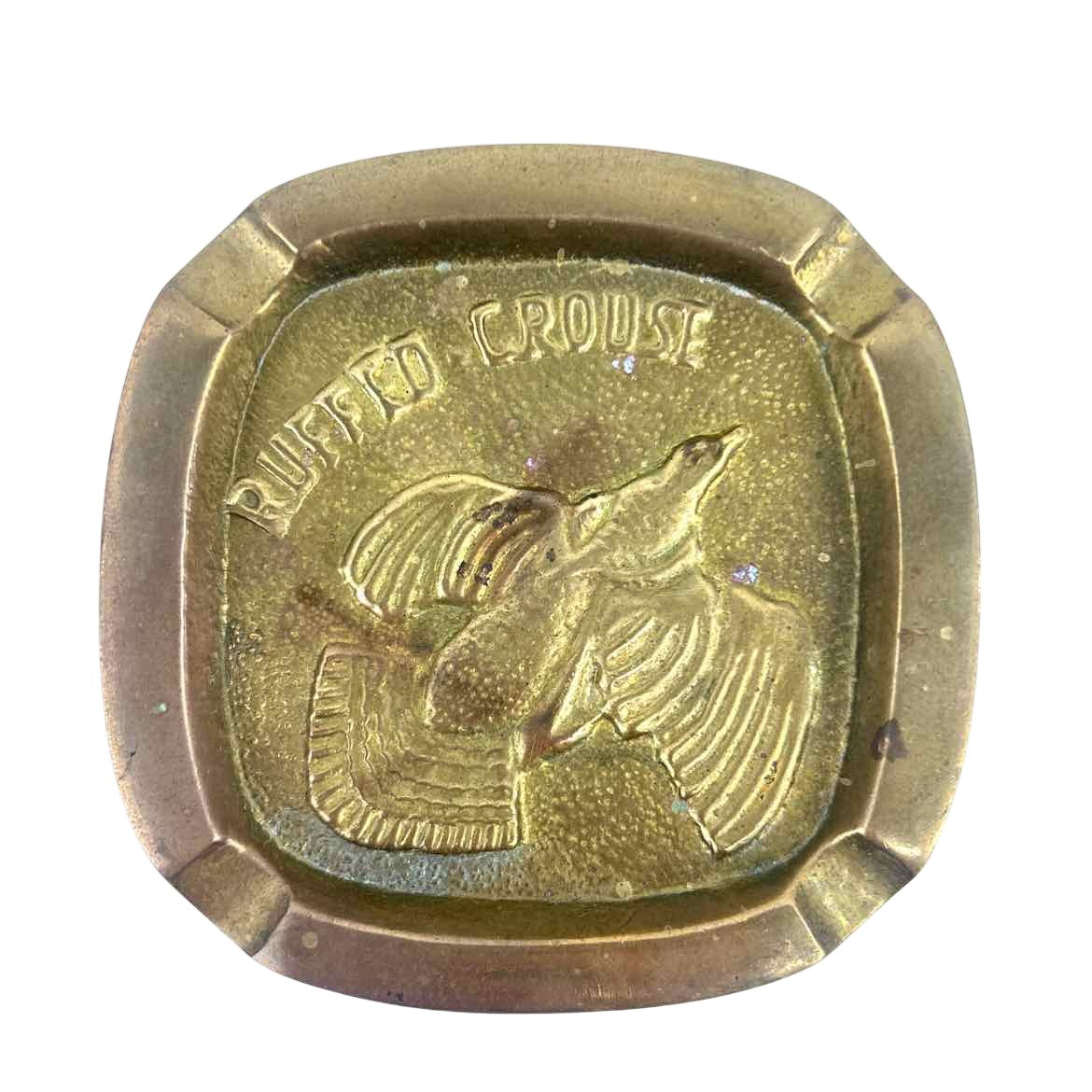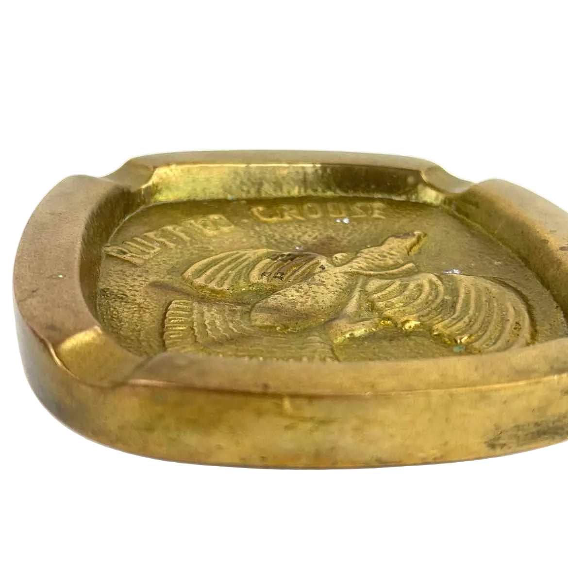 Heavy brass ashtray with a Ruffled Grouse flying game bird, a great gift for a hunter. In excellent vintage condition with original brass patina, but it is solid and can be polished to a higher shine.
