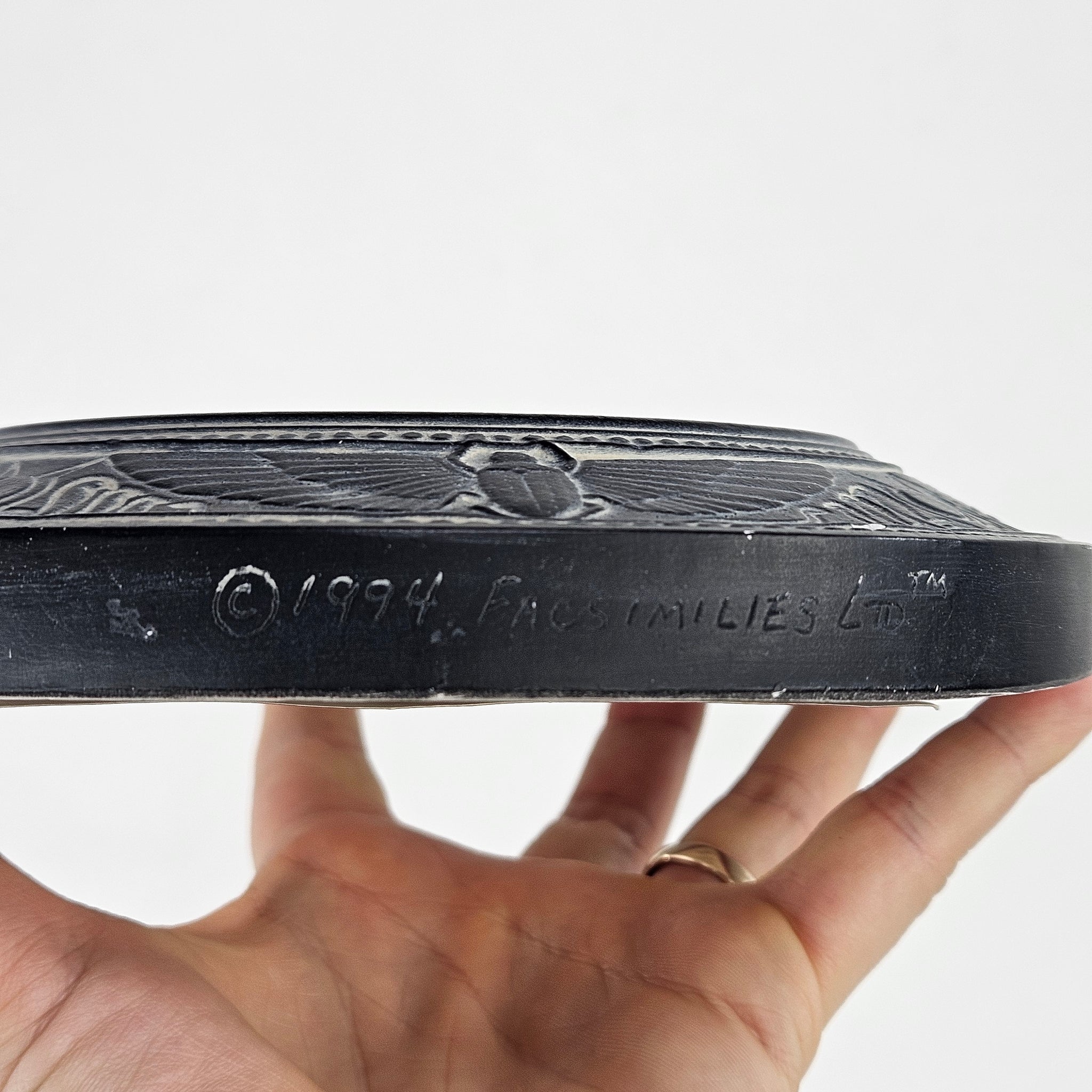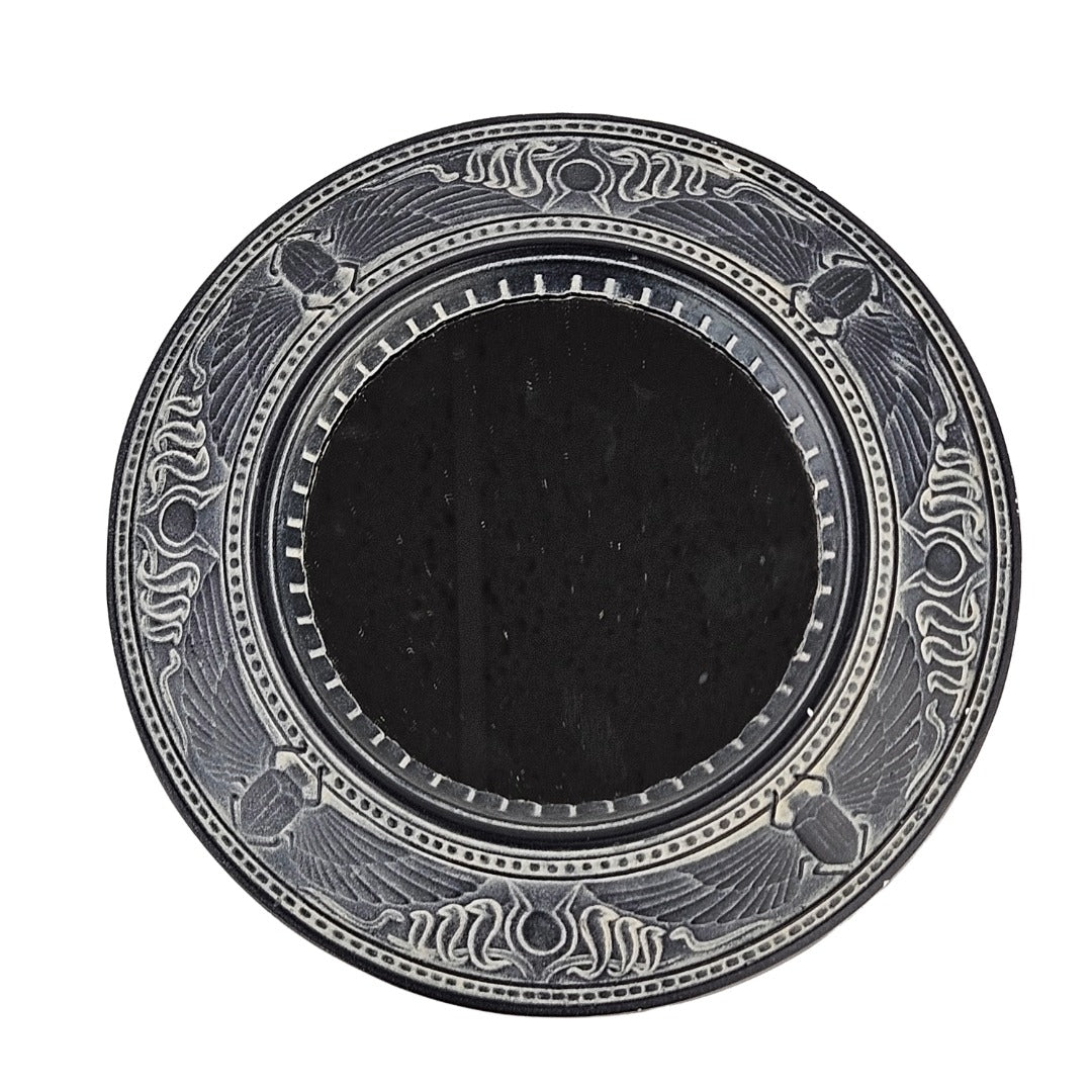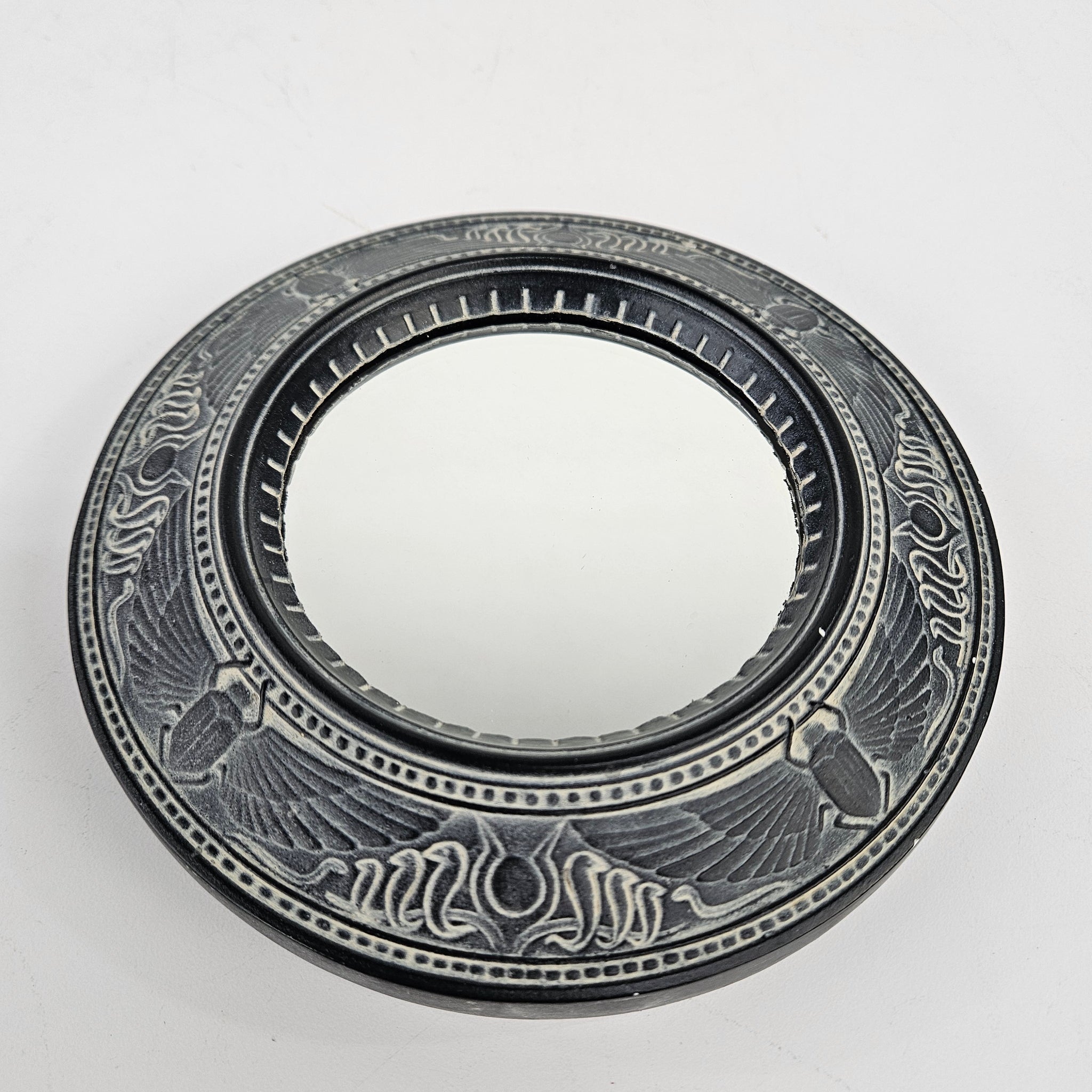 Small round mirror with scarab beetle details, made in New Hampshire by Facsimilies, Ltd. The label on the back says it was reproduced from a bronze original from an Egyptian revival period, French c. mid-1800s. Hangs with a notch in the plaster.
