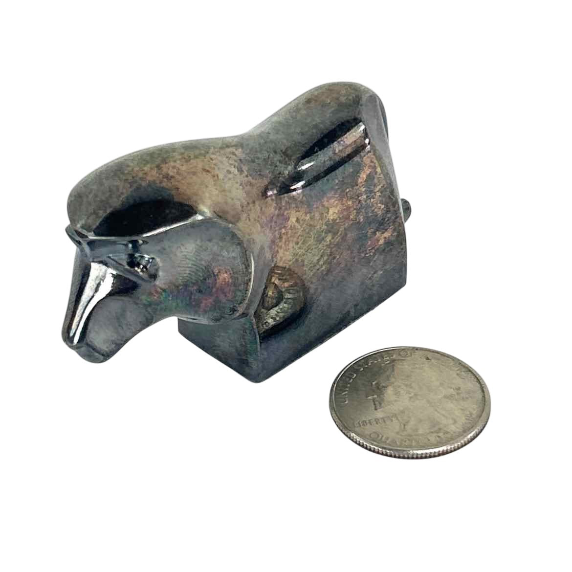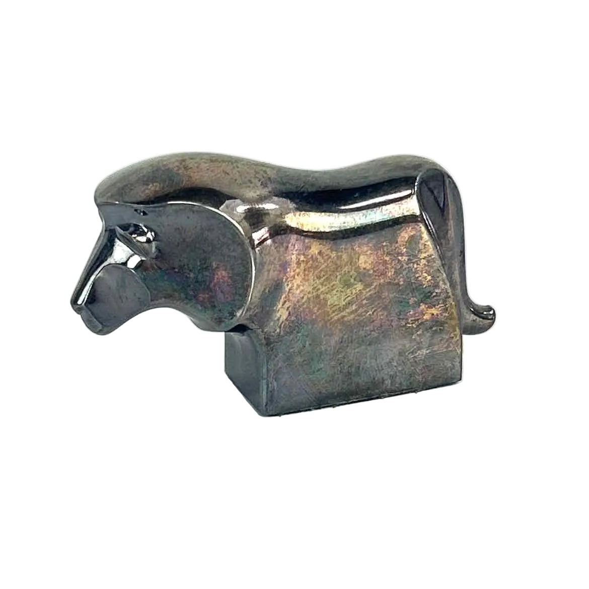 Heavy silver plated modern lion figurine by Dansk International. Marked underneath. In great condition with original dark silver patina, but could be polished to a high shine. Everyone needs a house hippo!