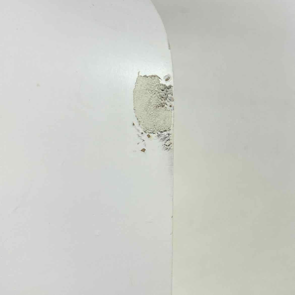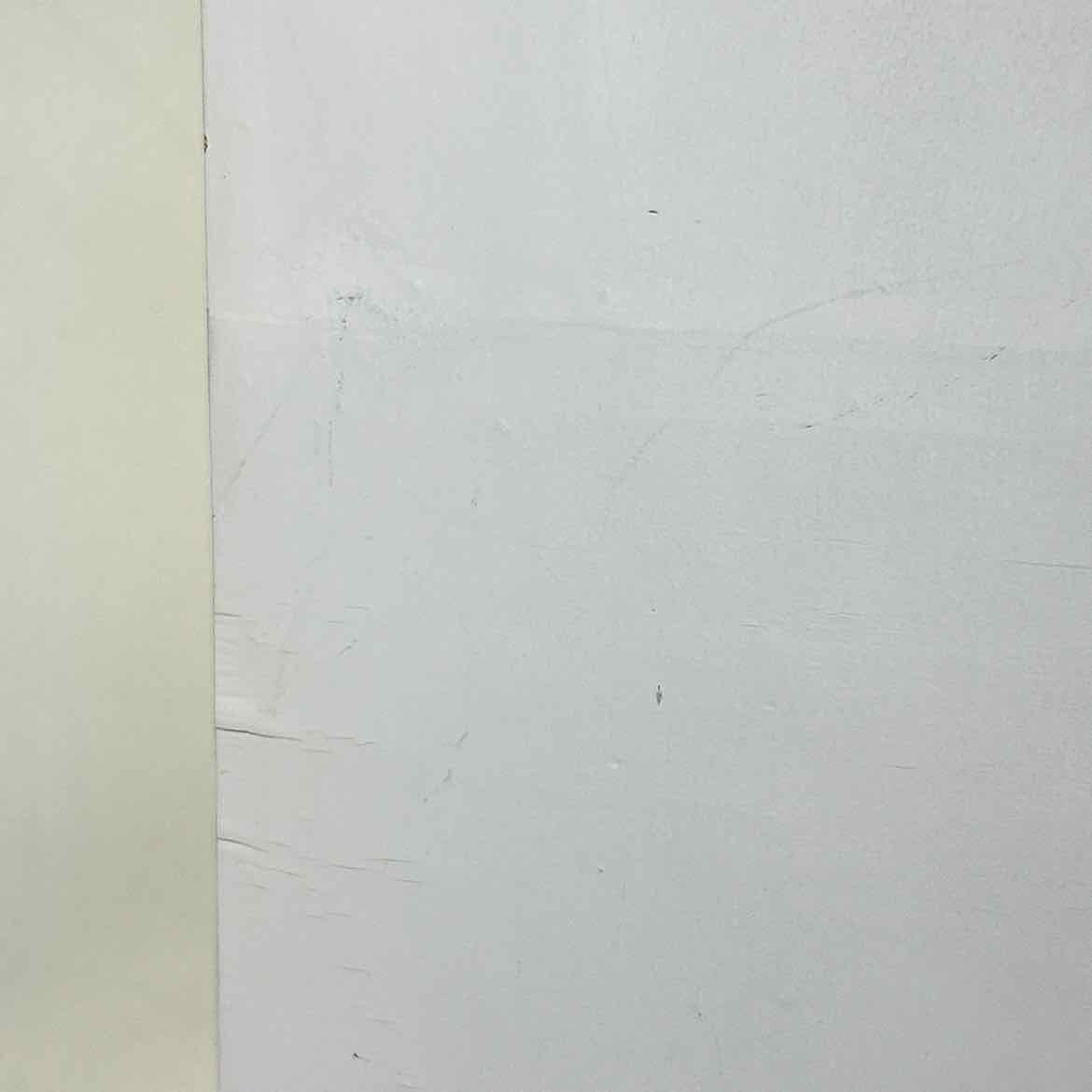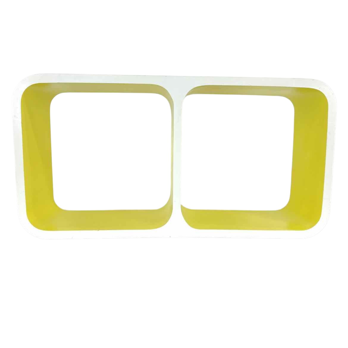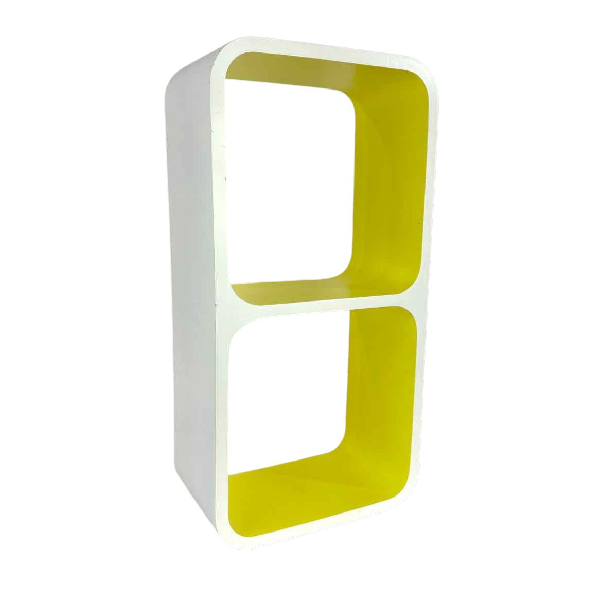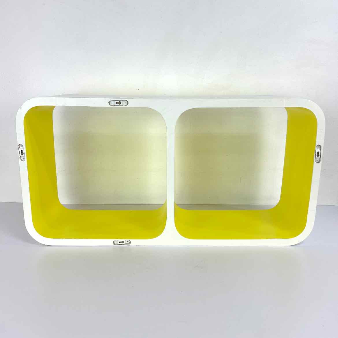 This white & yellow wall shelf has a Space Age style with rounded corners & two cubbies, but it looks more recently made, possibly 1990s. In very good vintage condition with some scuffs & light surface wear as shown. Keyhole hangers can hang both ways.