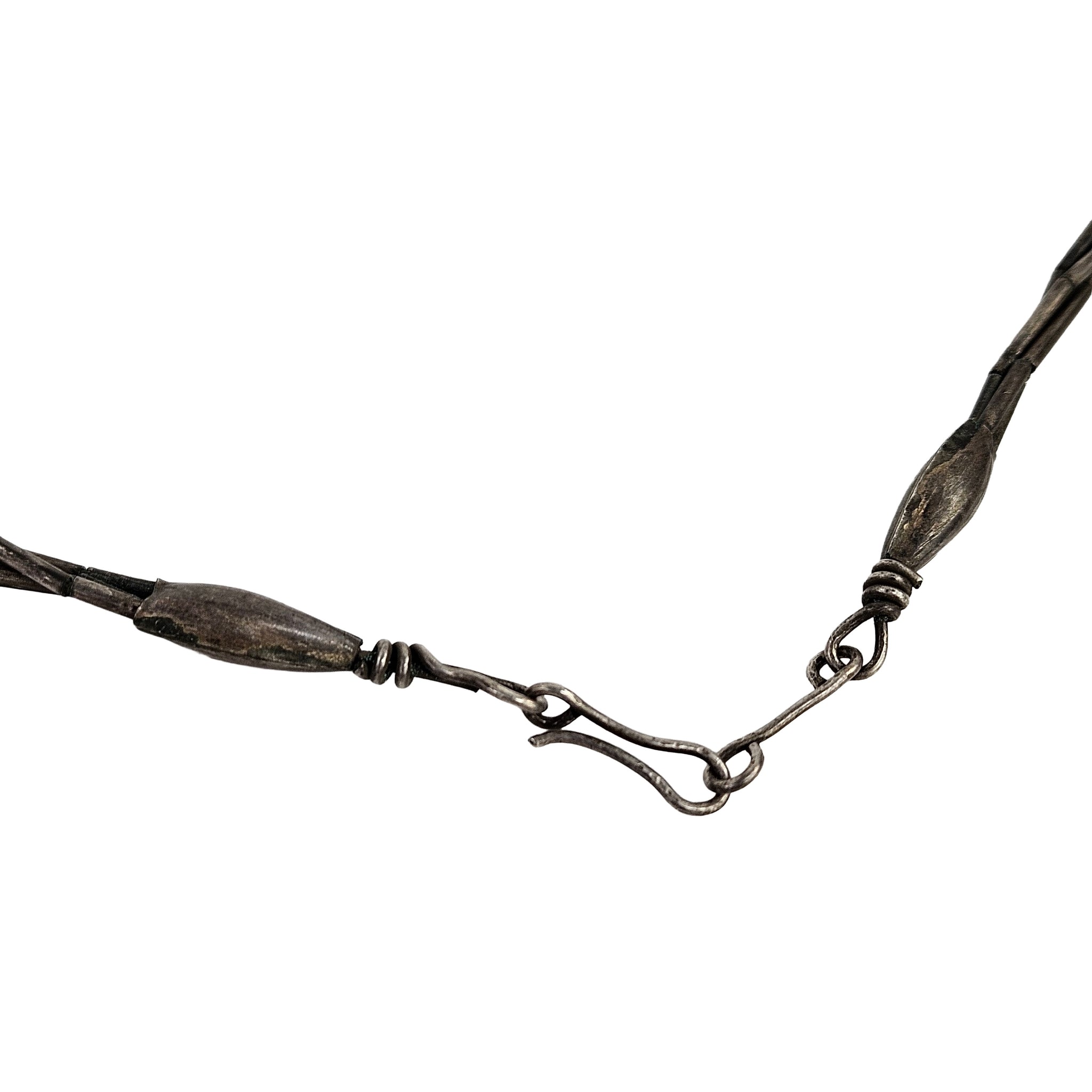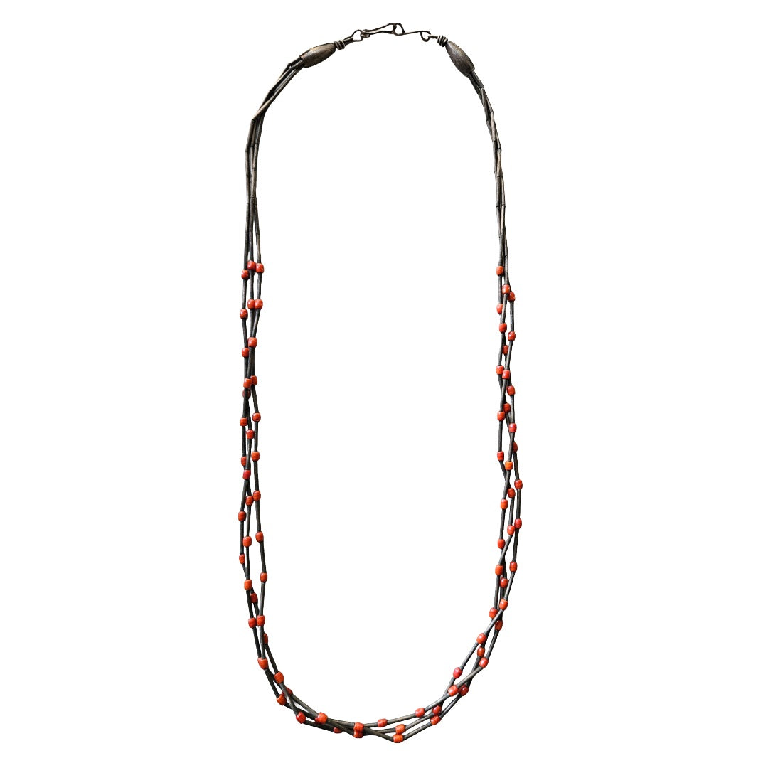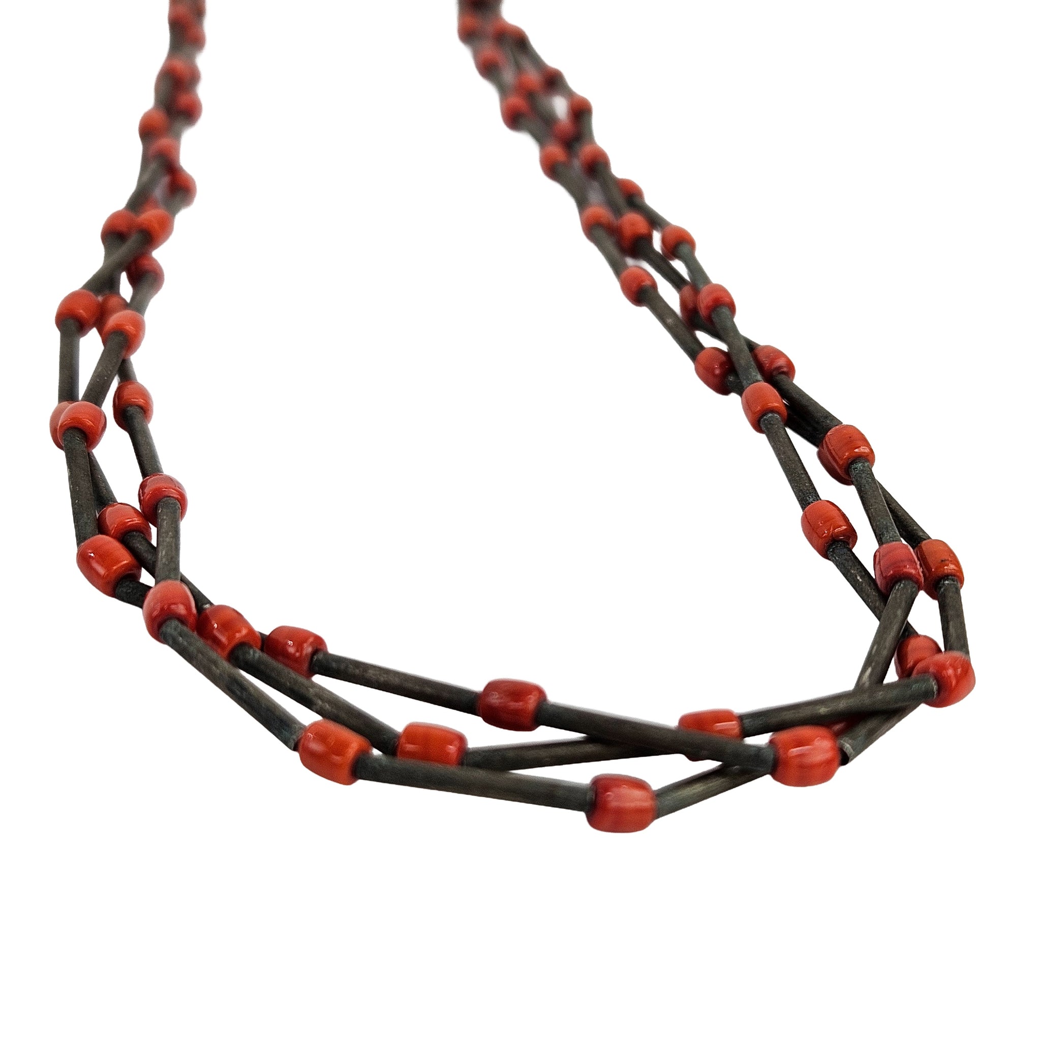 Vintage Navajo Native America multi-strand necklace made of sterling silver and red coral beads, with a simple hook clasp. The darkened patina pops nicely against the red, but it can be polished.