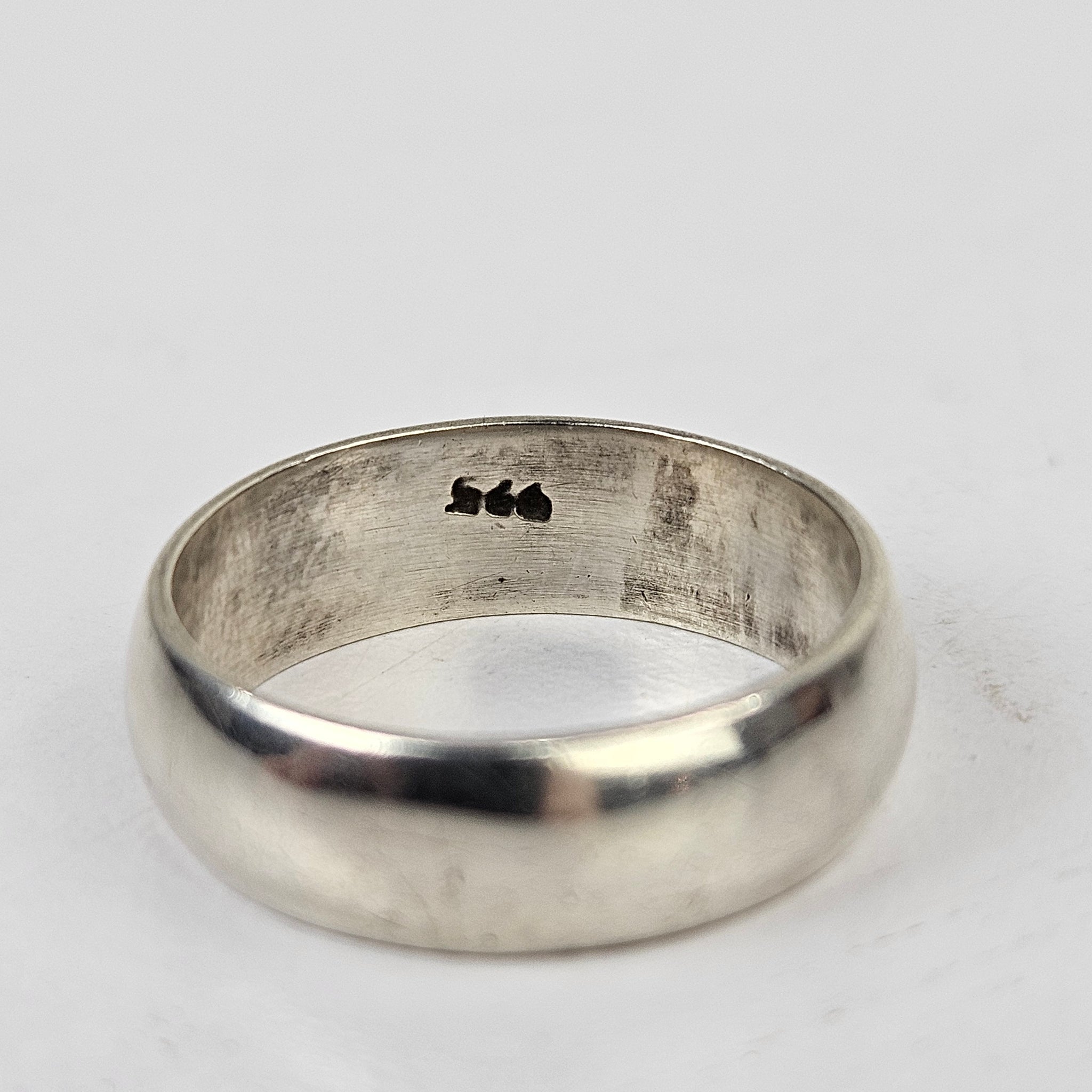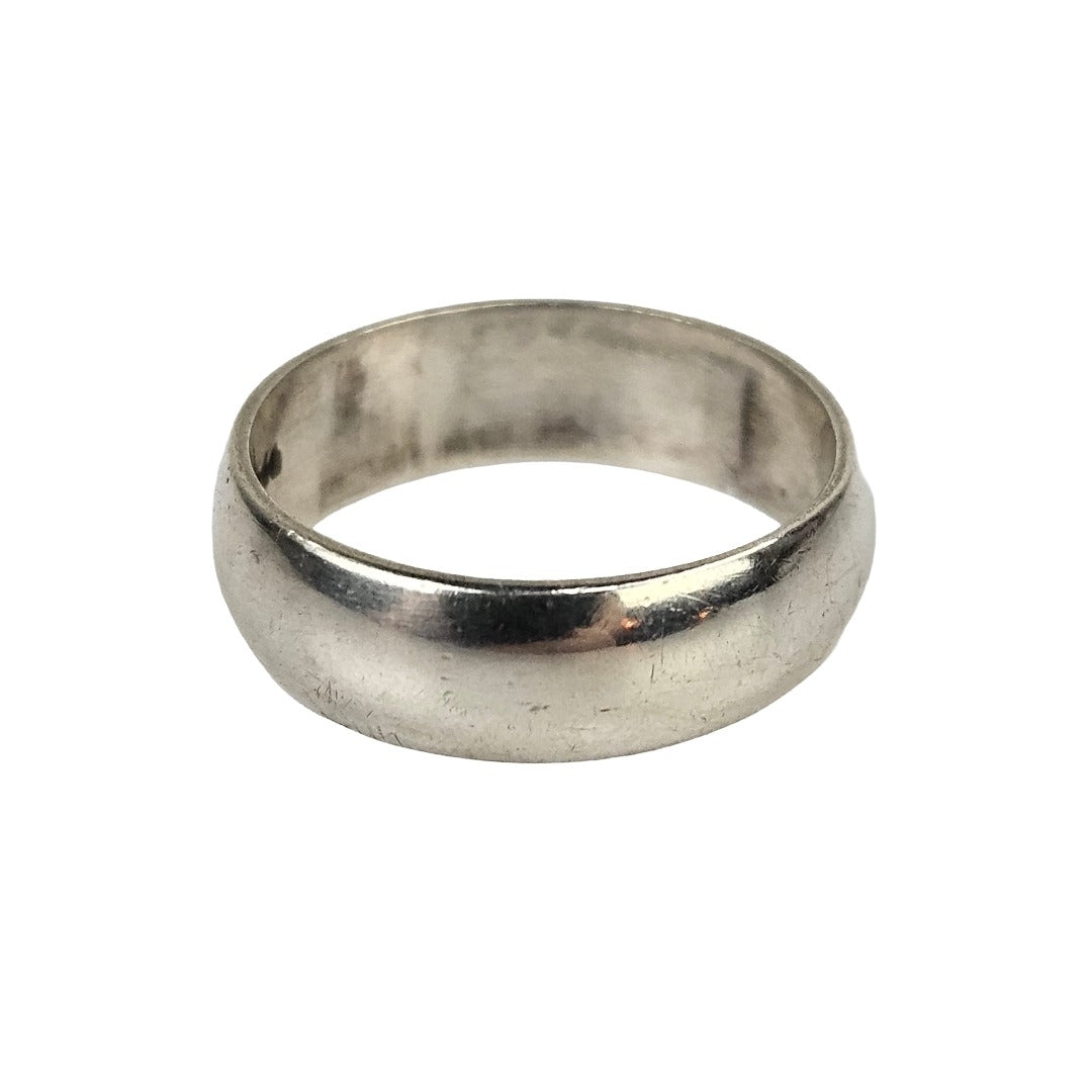 Sterling silver wedding band with a wide, smooth band. Stamped .925 and polished, in very good vintage condition. The band measures approximate .25" wide.