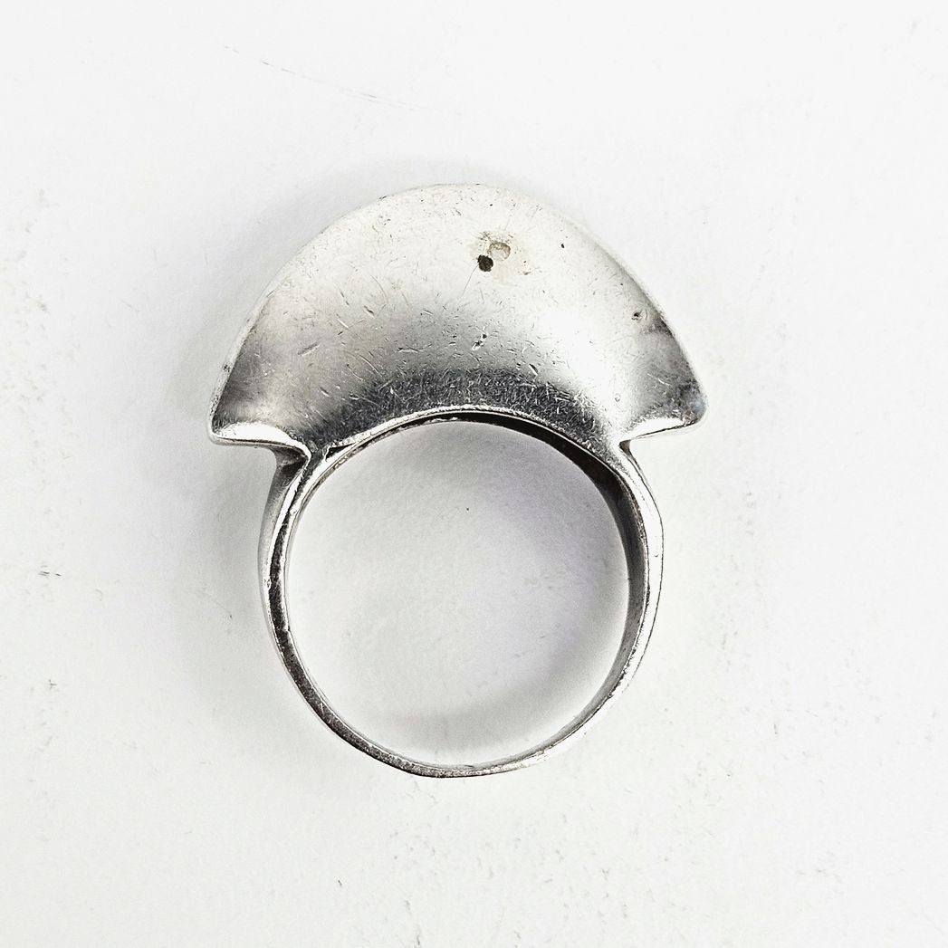 Sterling silver statement ring with a large modern crest design. Stamped 925 and in excellent vintage condition with small imperfections from being handmade.