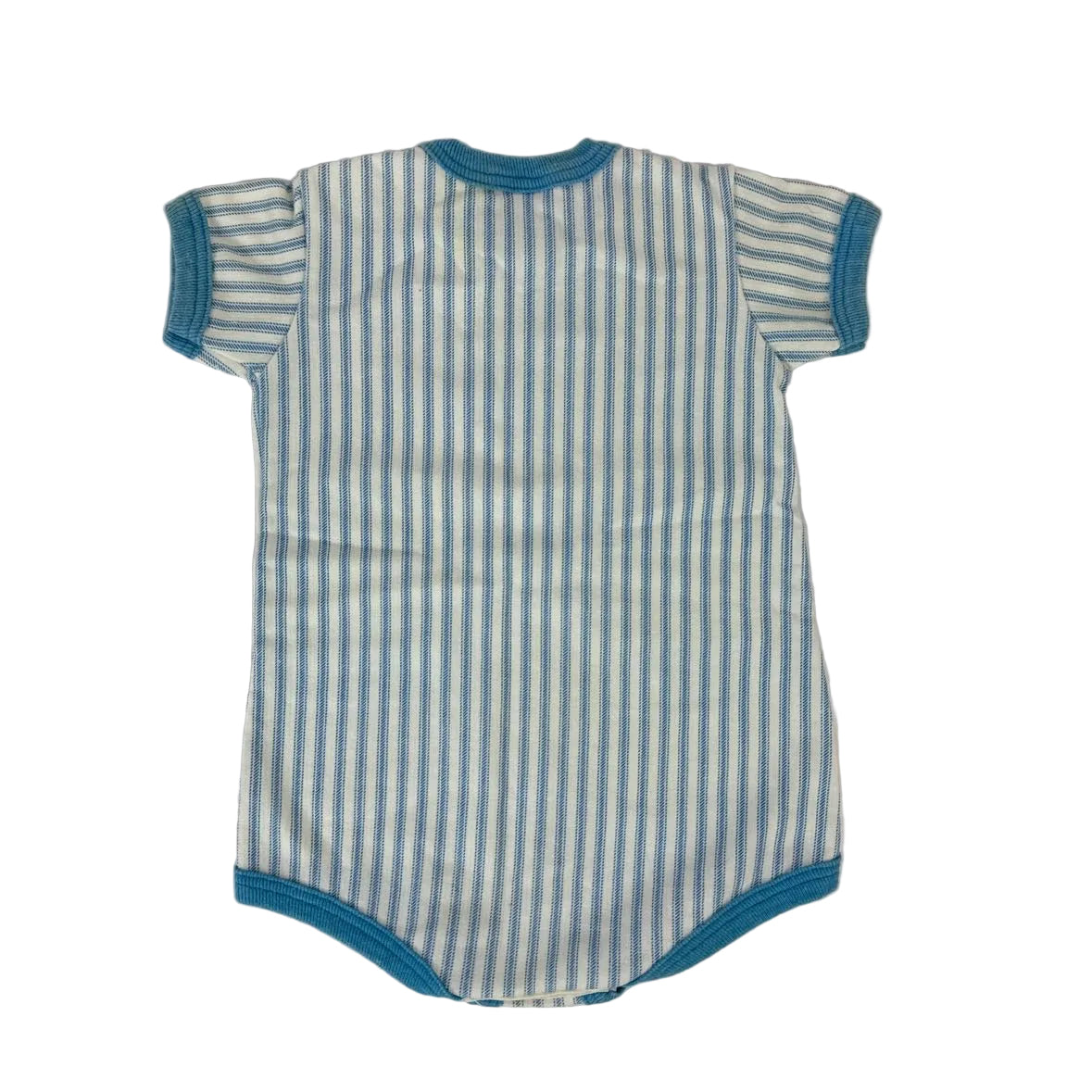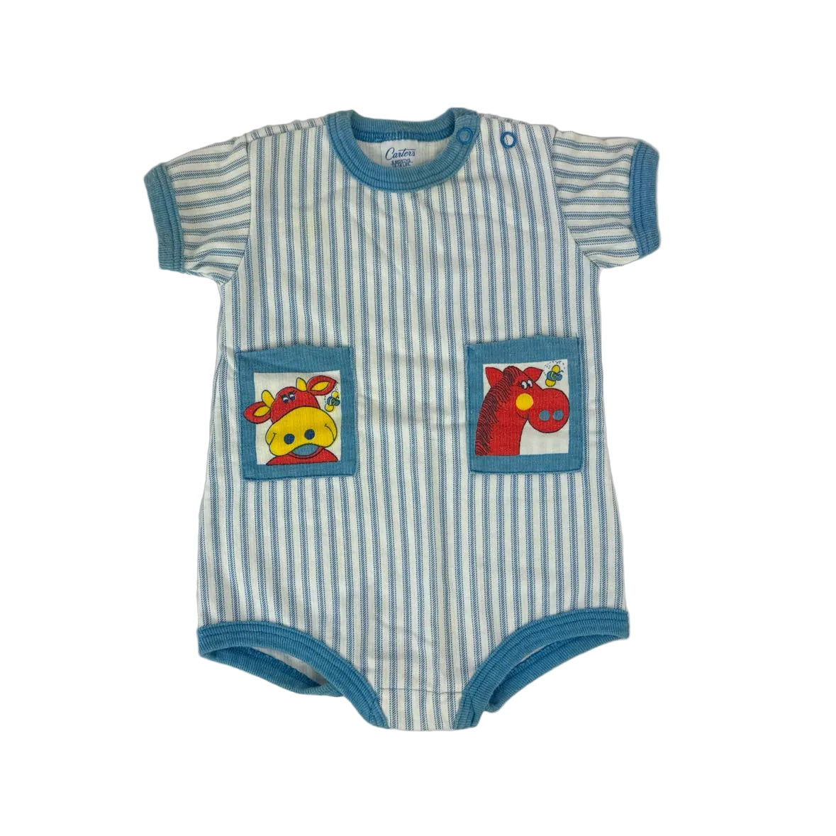 Striped baby onesie with cow and horse cartoons on the pockets. Yes, it has pockets for a 6 month old. Made by Carters c. 1980s, 50% Cotton/ and 50% Polyester. In very good vintage condition for its age with some light wear.