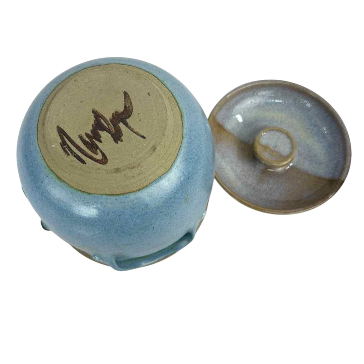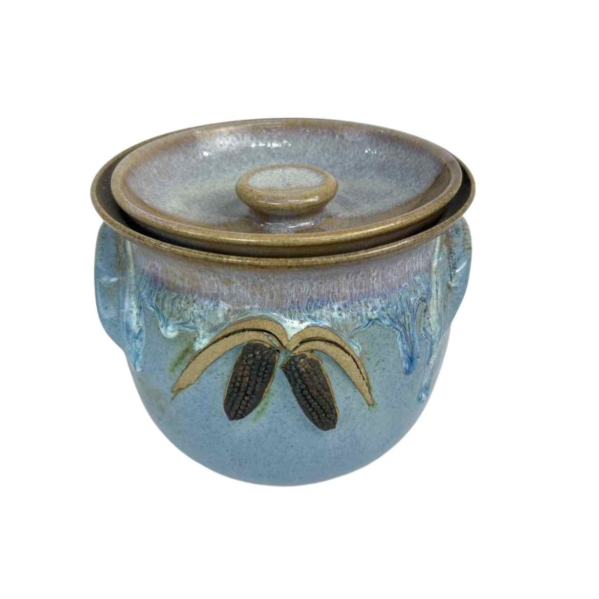 Handmade studio pottery bowl with a blue glaze and hand formed corn accents. In very good vintage condition with no damage, but some imperfections due to being handmade. Signed by the artist on the underside.