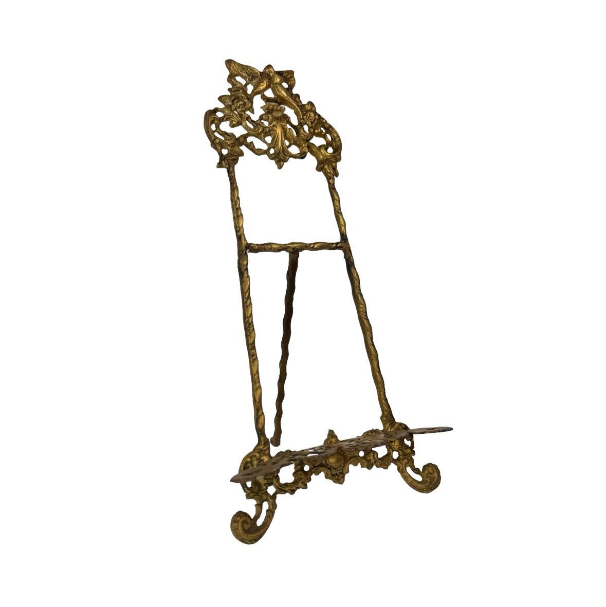Brass tabletop easel with ornate details and lovebirds at the top. In good vintage condition with original brass patina. Perfect for displaying a small piece of art, a plate or a mirror.
