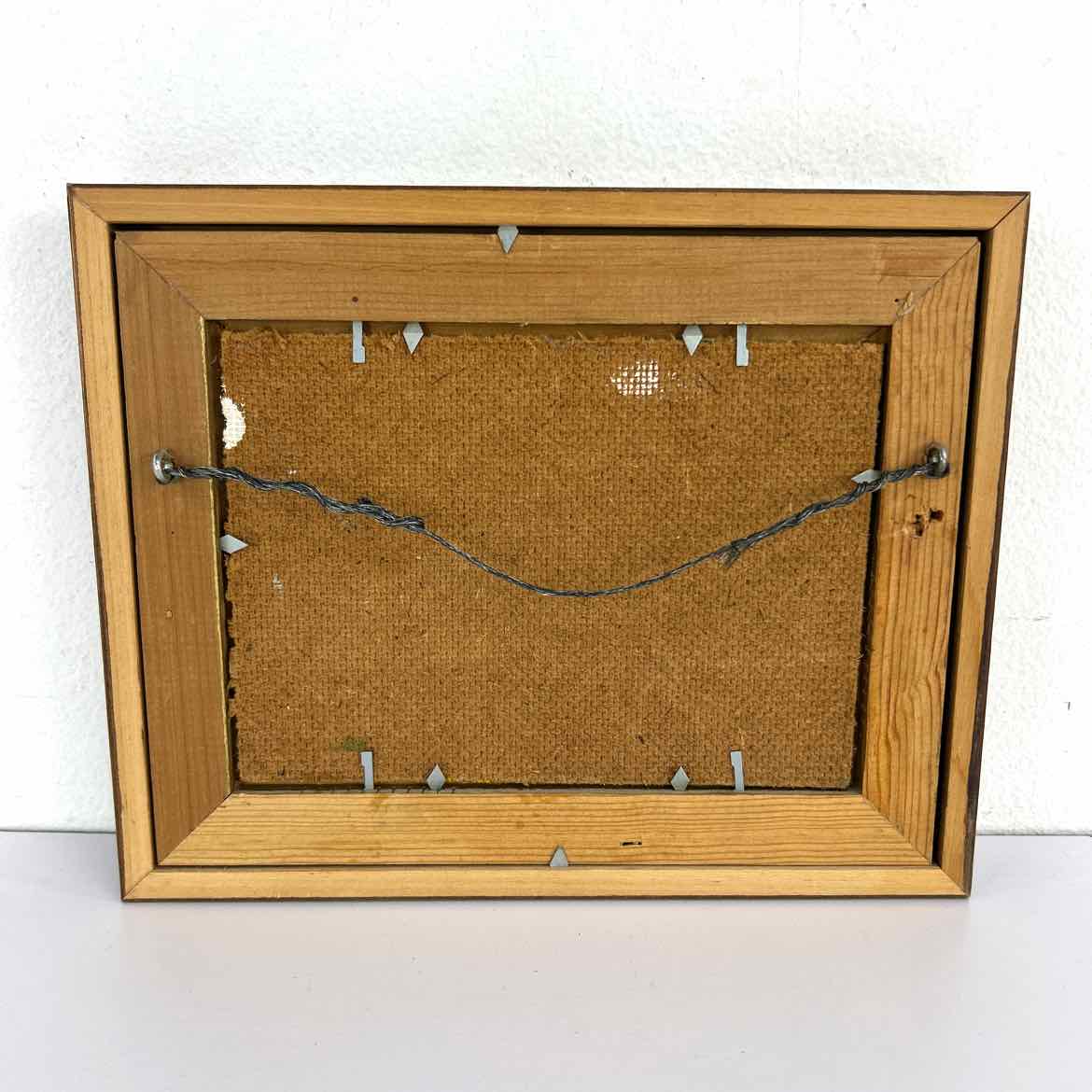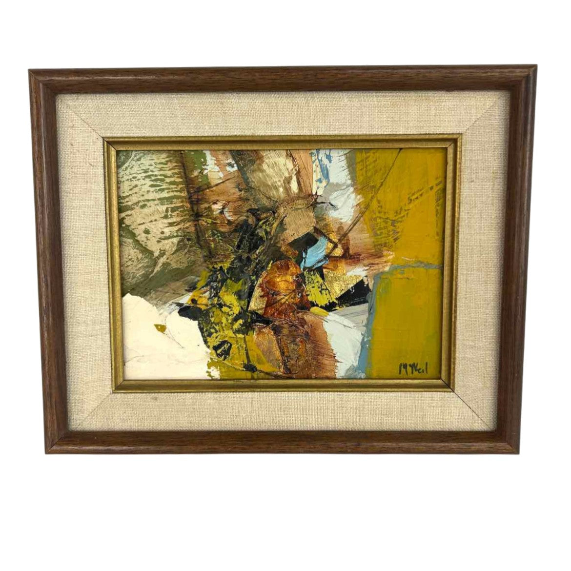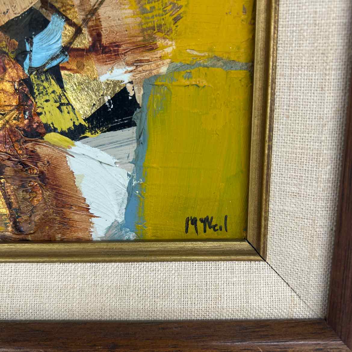 Small original textural abstract painting in a wooden frame, signed McNeil and in very good vintage condition. This is a timeless piece with elevated style and touches of metallic gold.