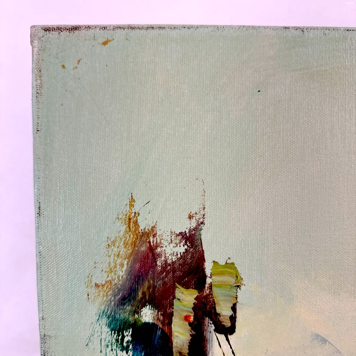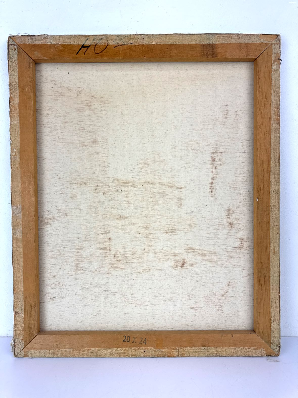 Vintage heavily textured cityscape that looks like a European city with a dome in the background & people walking on a street in the foreground. Features aqua & other great colors with heavy palette knife texture. Unframed & unfinished edges.