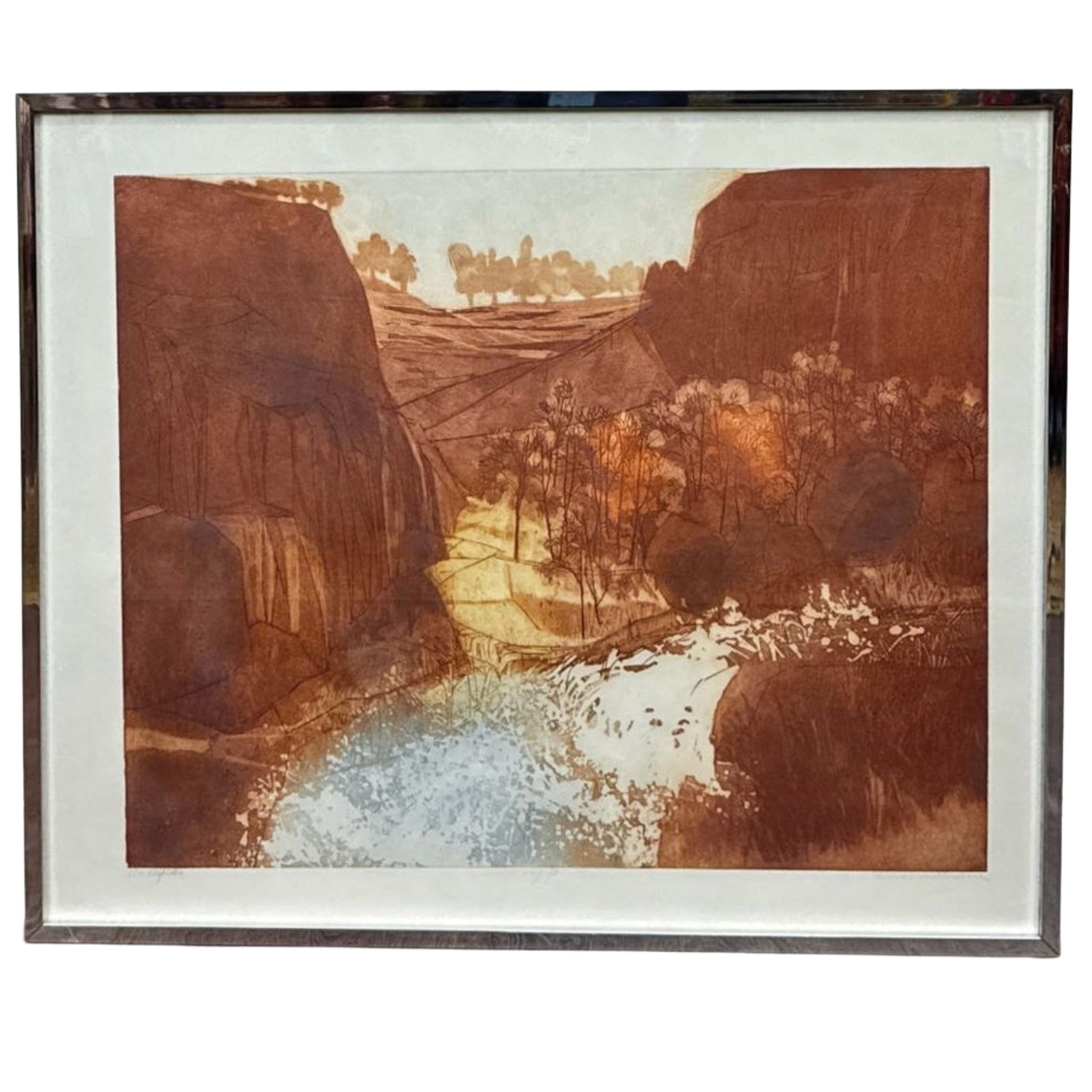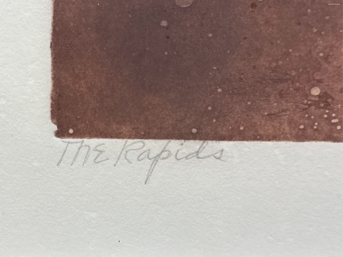 Framed embossed landscape lithograph print titled The Rapids by American artist Russa Graeme (1919-1995) in excellent vintage condition and ready to hang. Signed Artist's Proof 3. | The sale of this item benefits Meals on Wheels in Midland, Tx.
