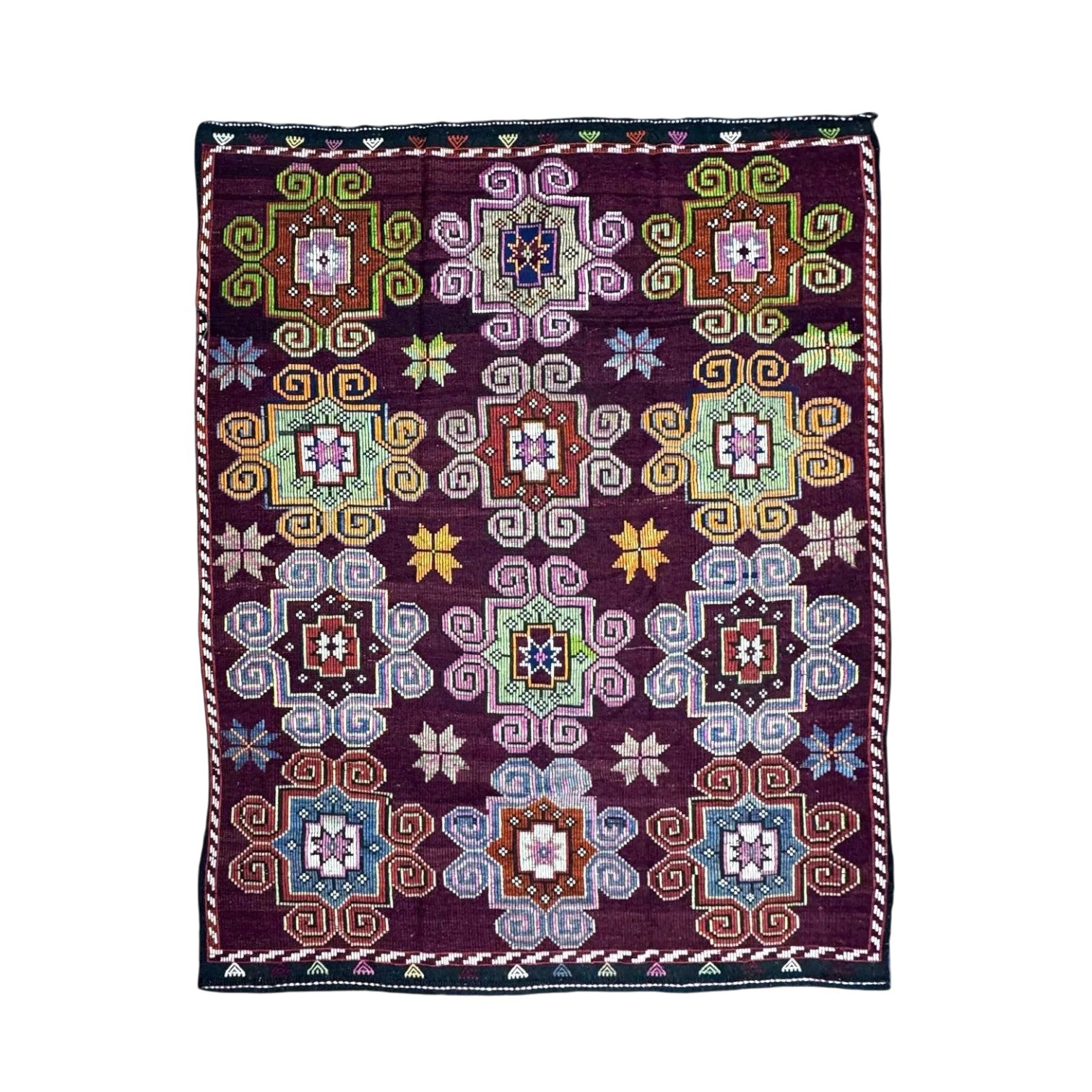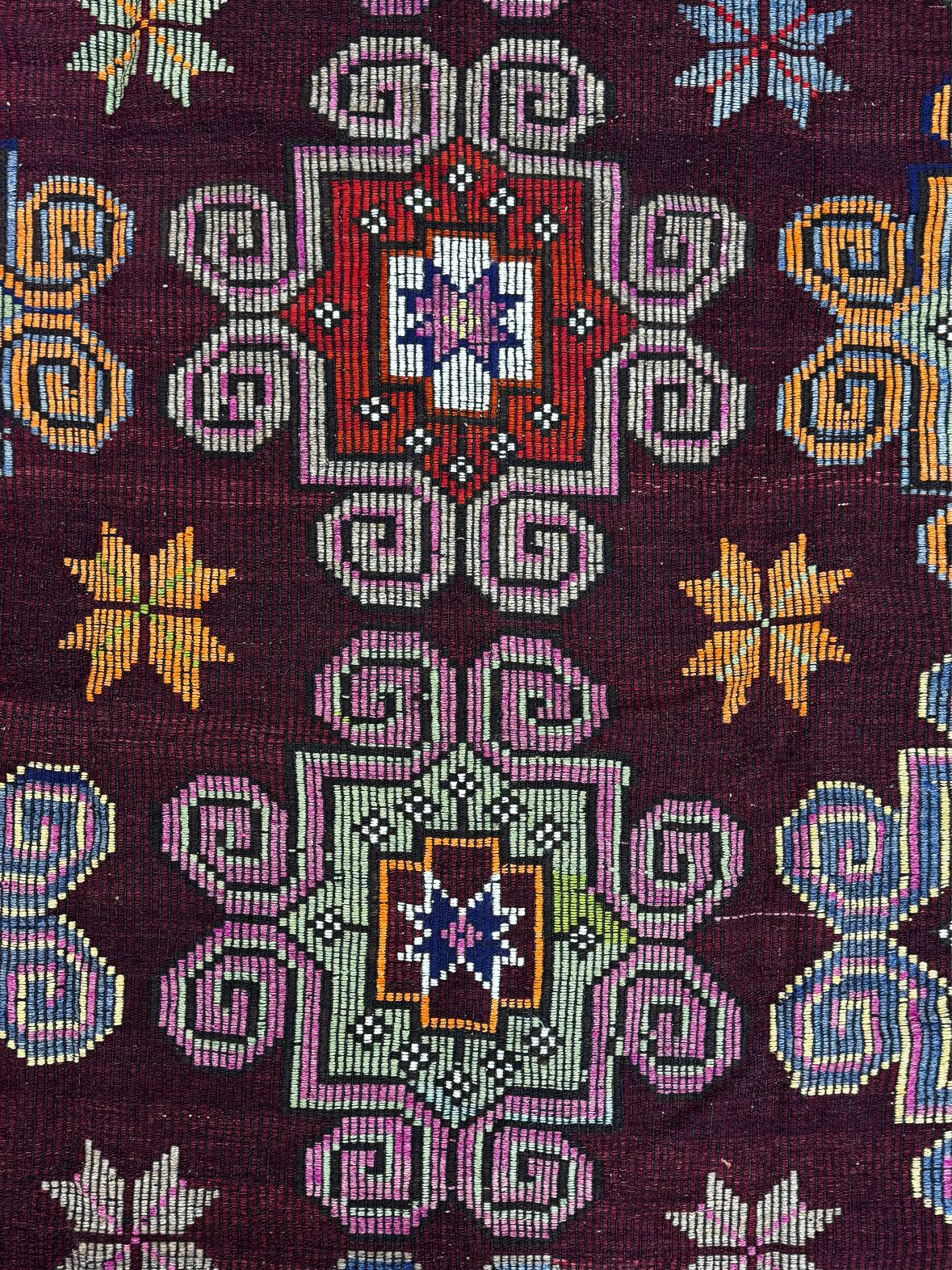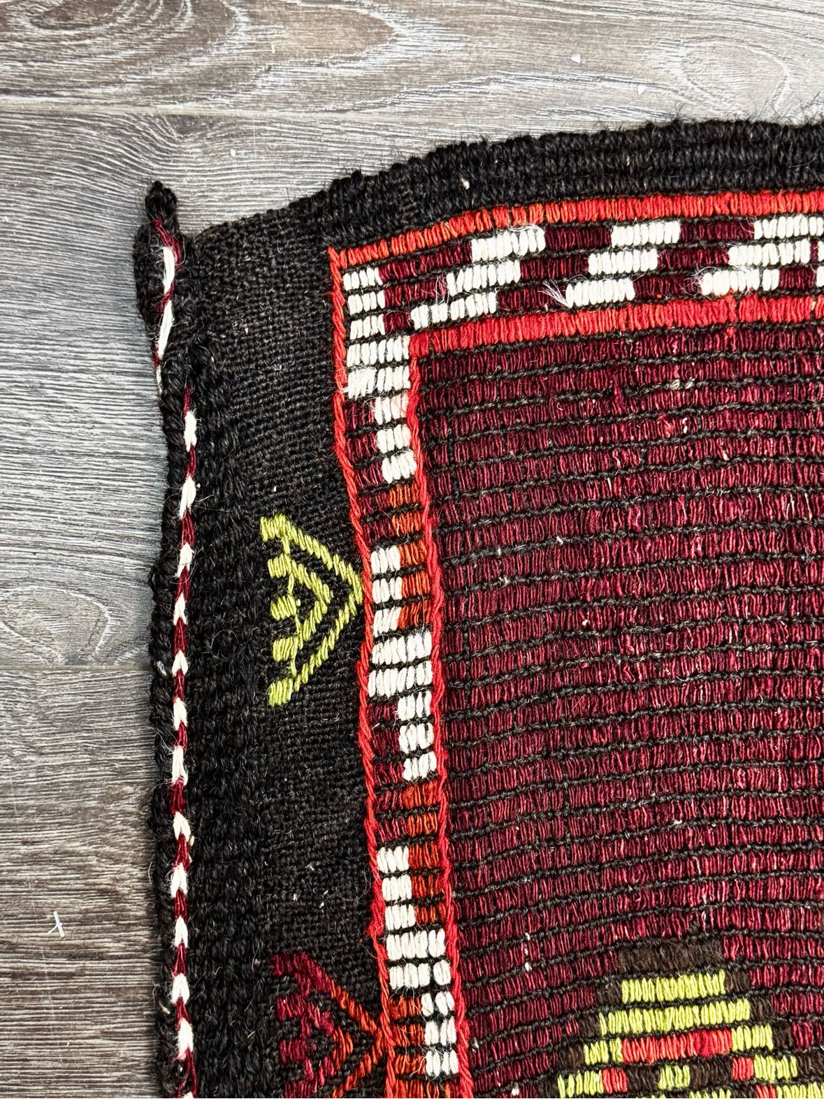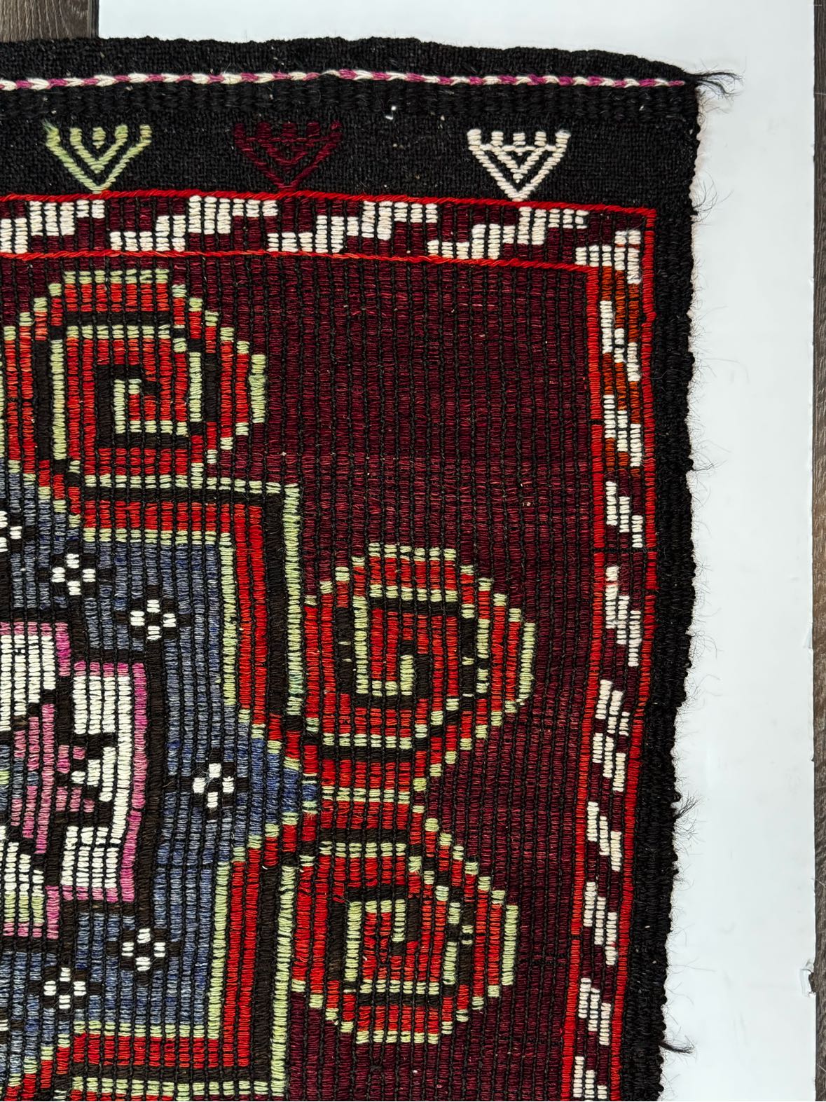 Large 7x9 Turkish kilim area rug with amazing colors and textures, clean and in very good vintage condition. It isn't labeled, but looks to be Turkish and is most likely wool. Contact for shipping! Colors: maroon, black, red, pink, blue and green.