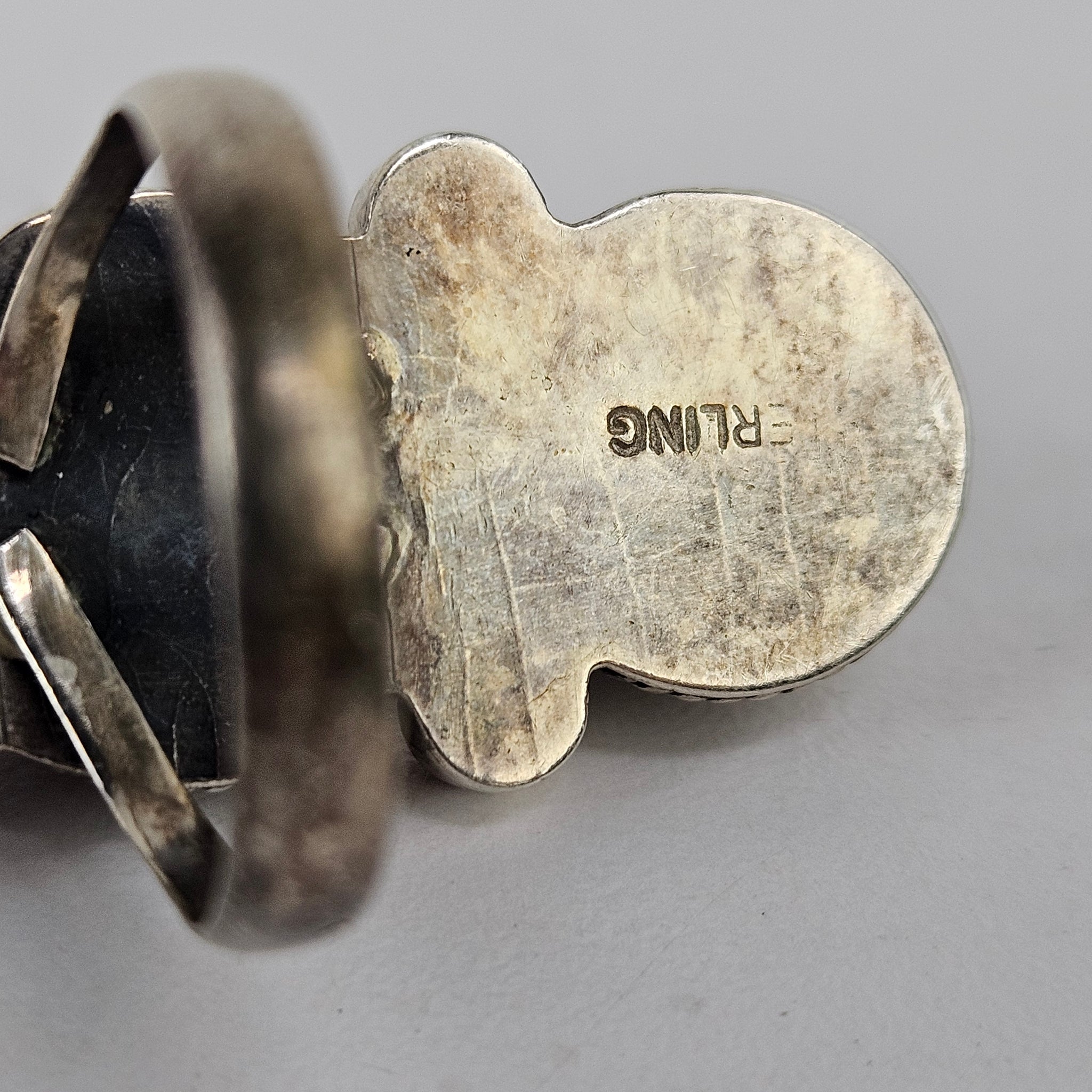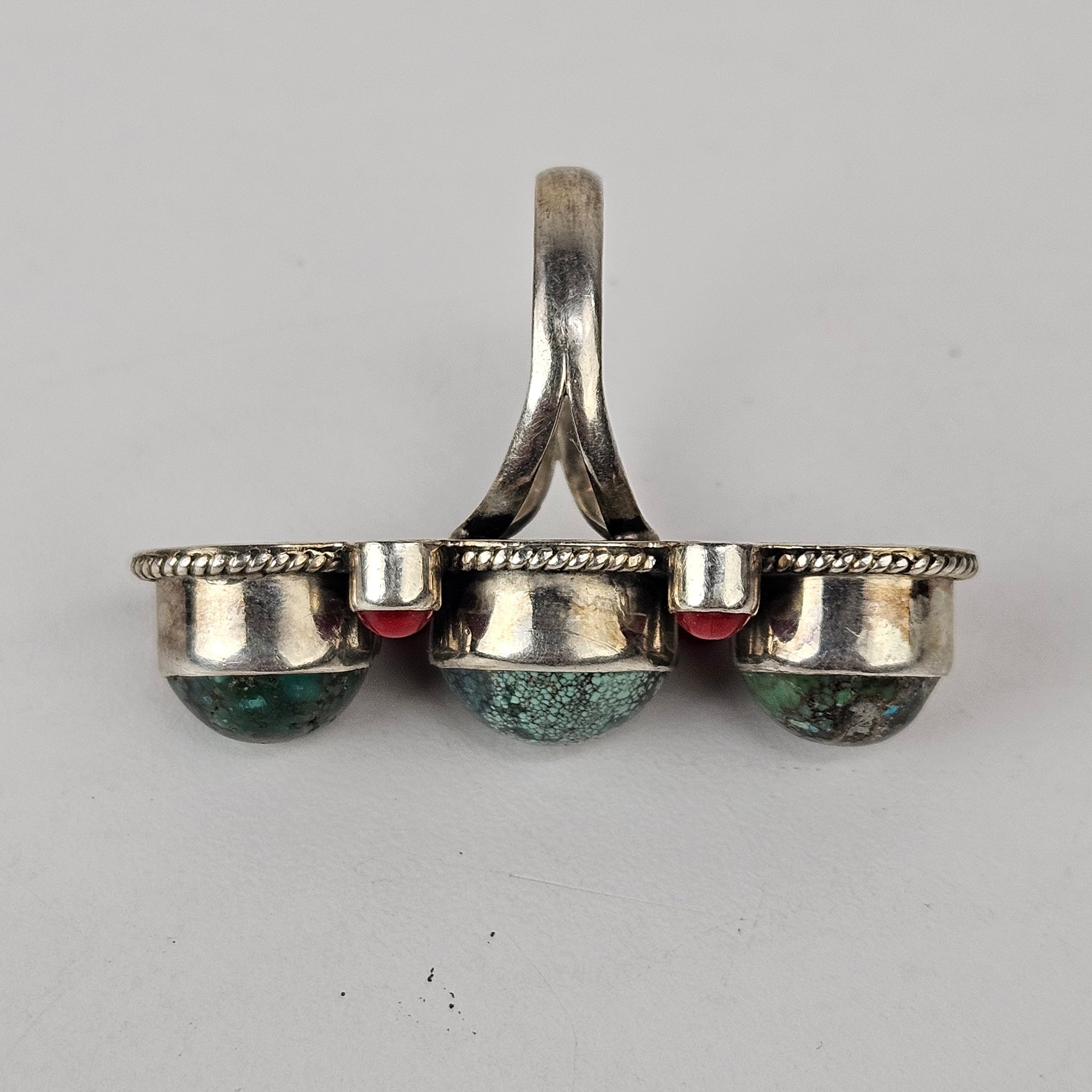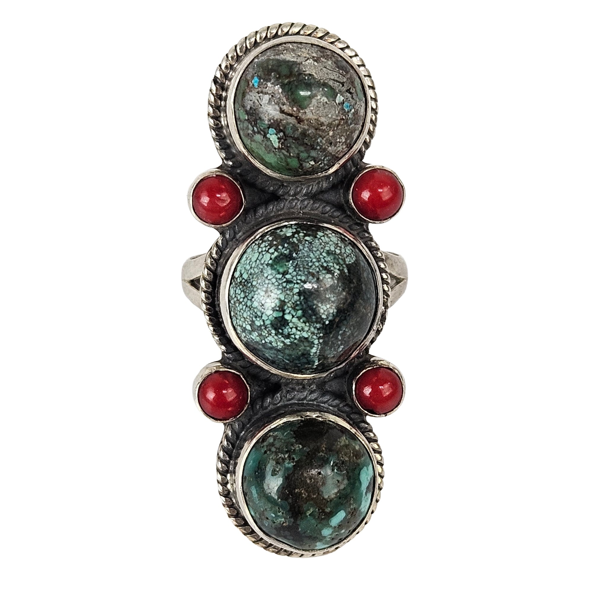 Large sterling silver statement ring with 3 large green turquoise stones and 6 small red coral ones, in very good vintage condition with a bright patina. Stamped Sterling.