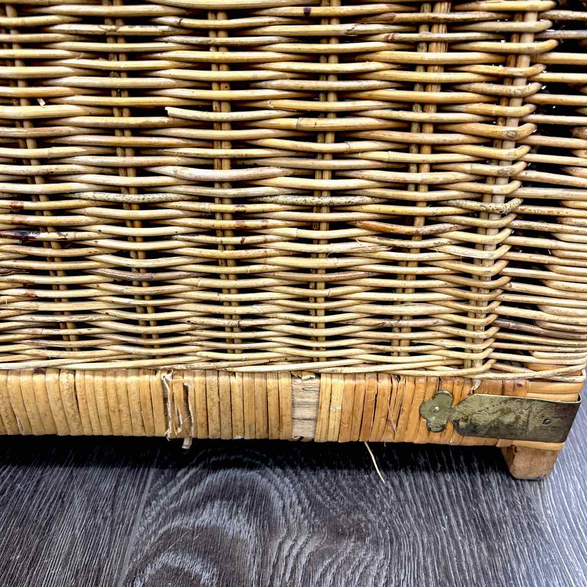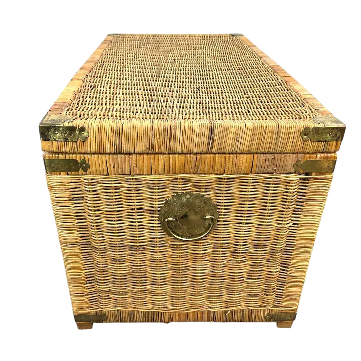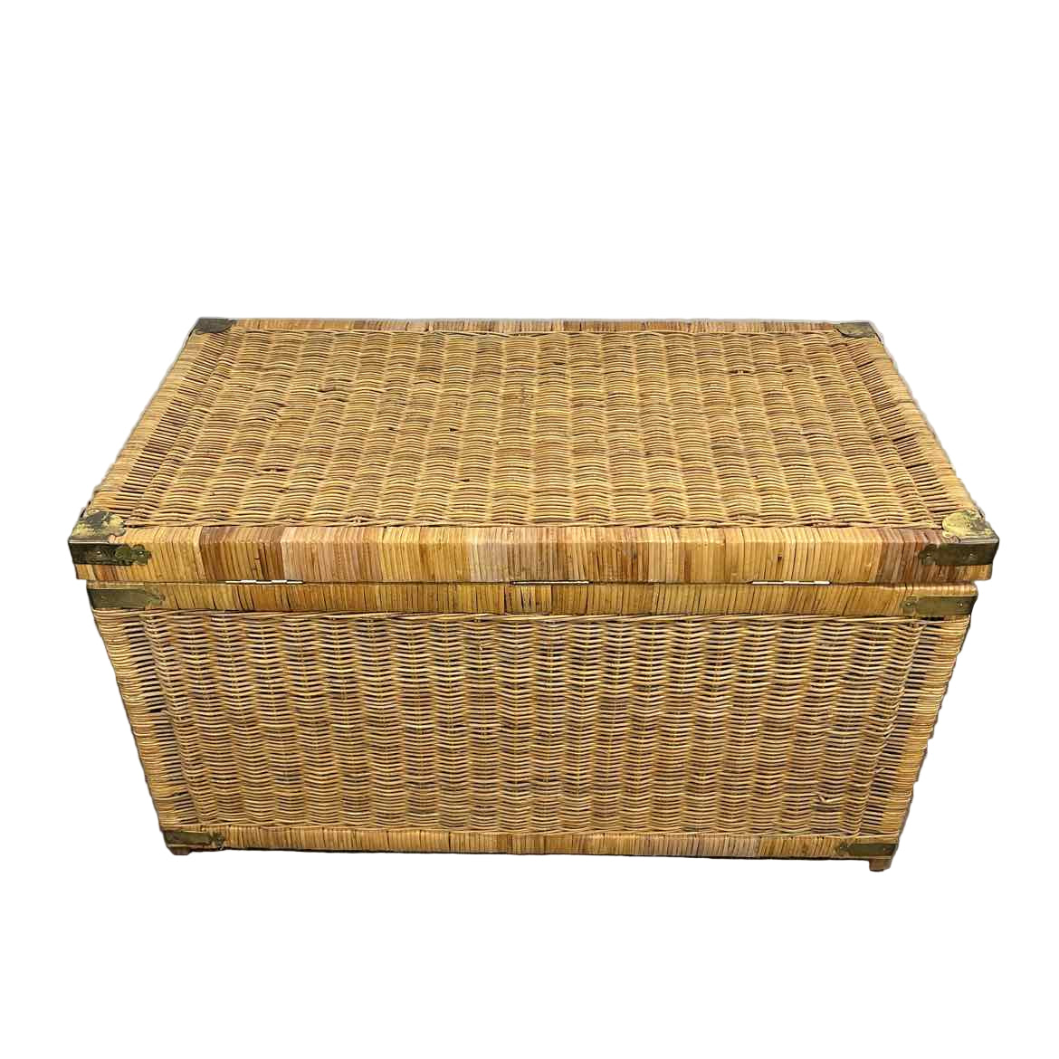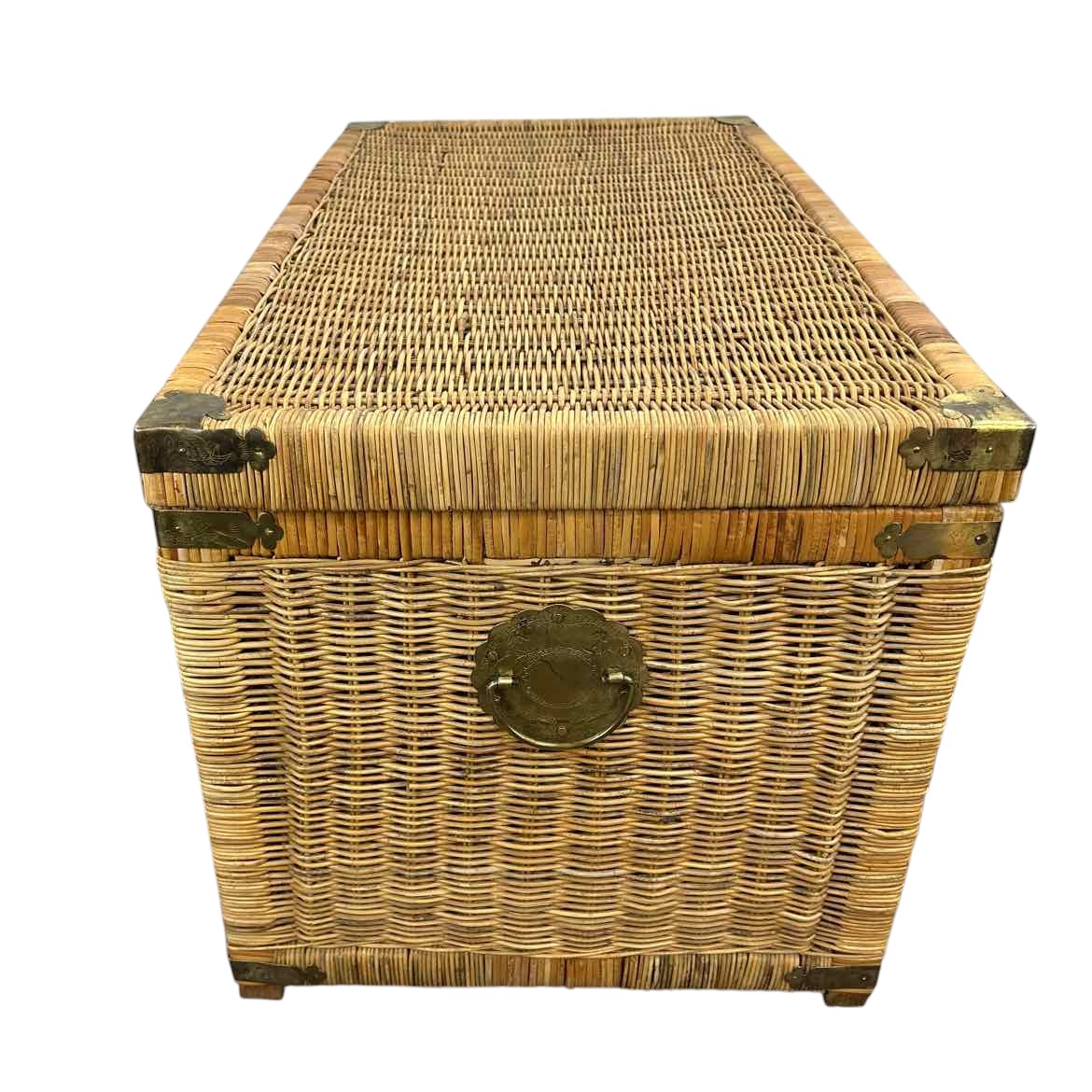 Large wicker trunk with nice brass hardware and campaign corners. IN very good vintage condition with some minor wear from age. Perfect size for a coffee table, or at the foot of a bed for blankets or toys.