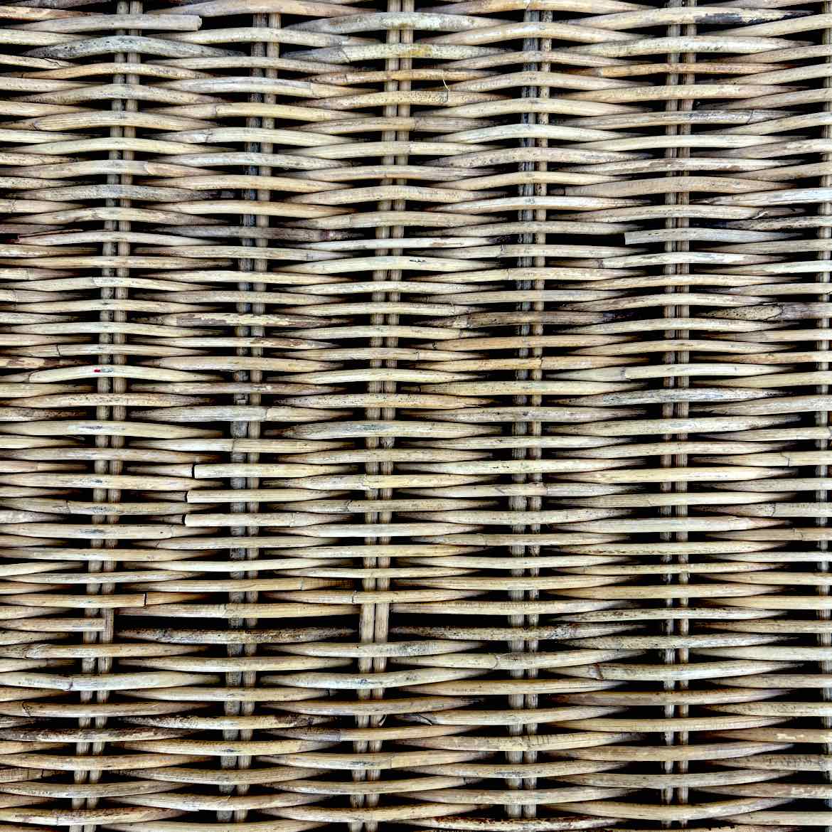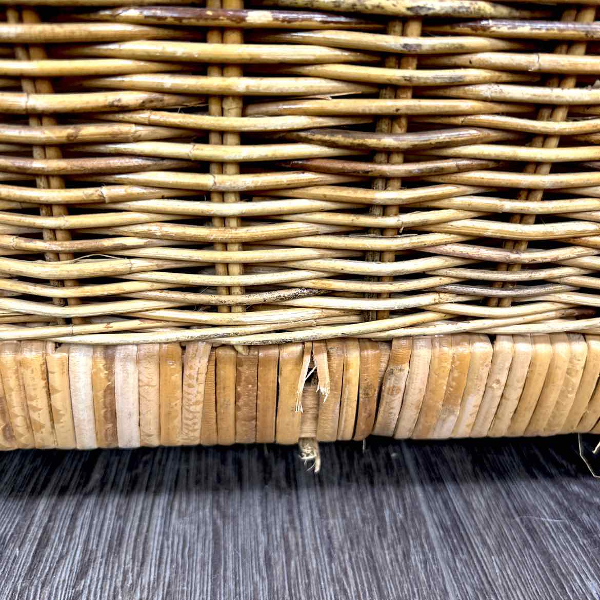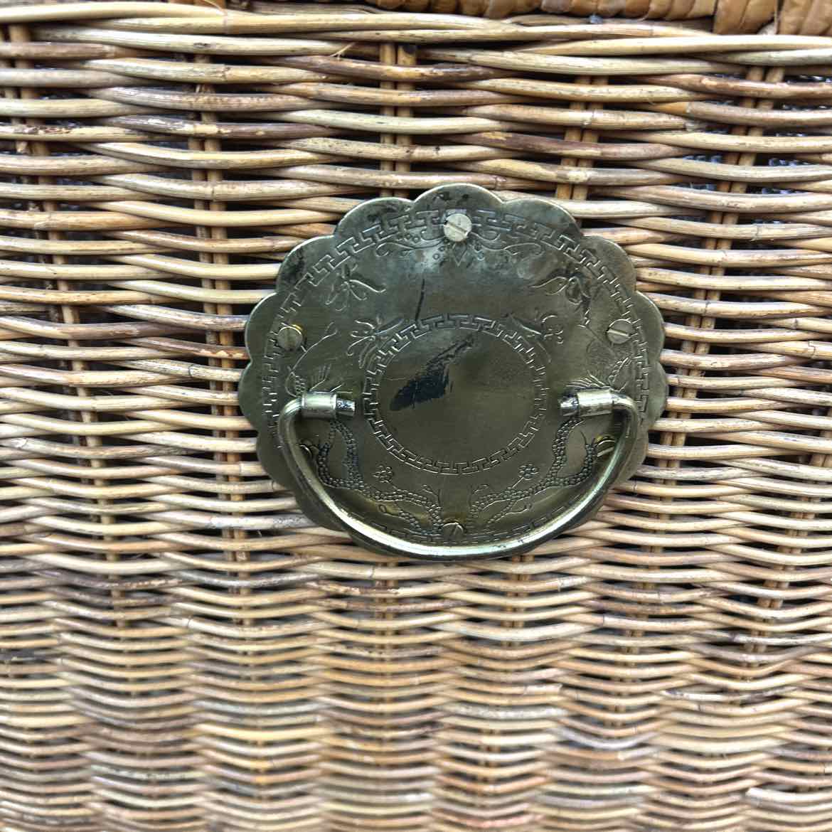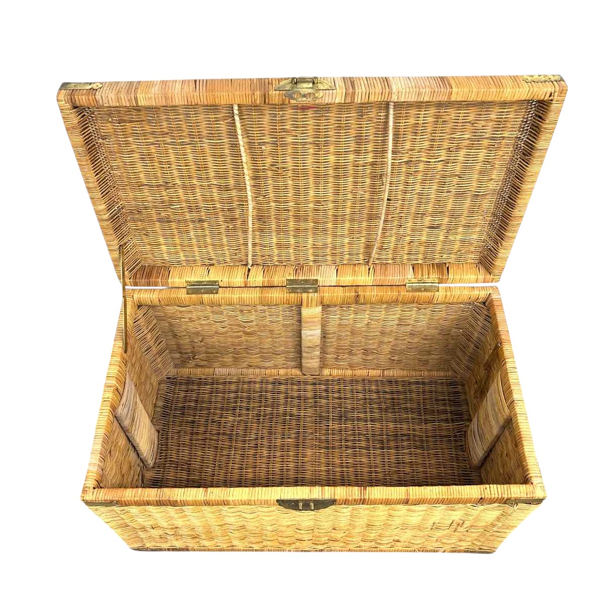 Large wicker trunk with nice brass hardware and campaign corners. IN very good vintage condition with some minor wear from age. Perfect size for a coffee table, or at the foot of a bed for blankets or toys.