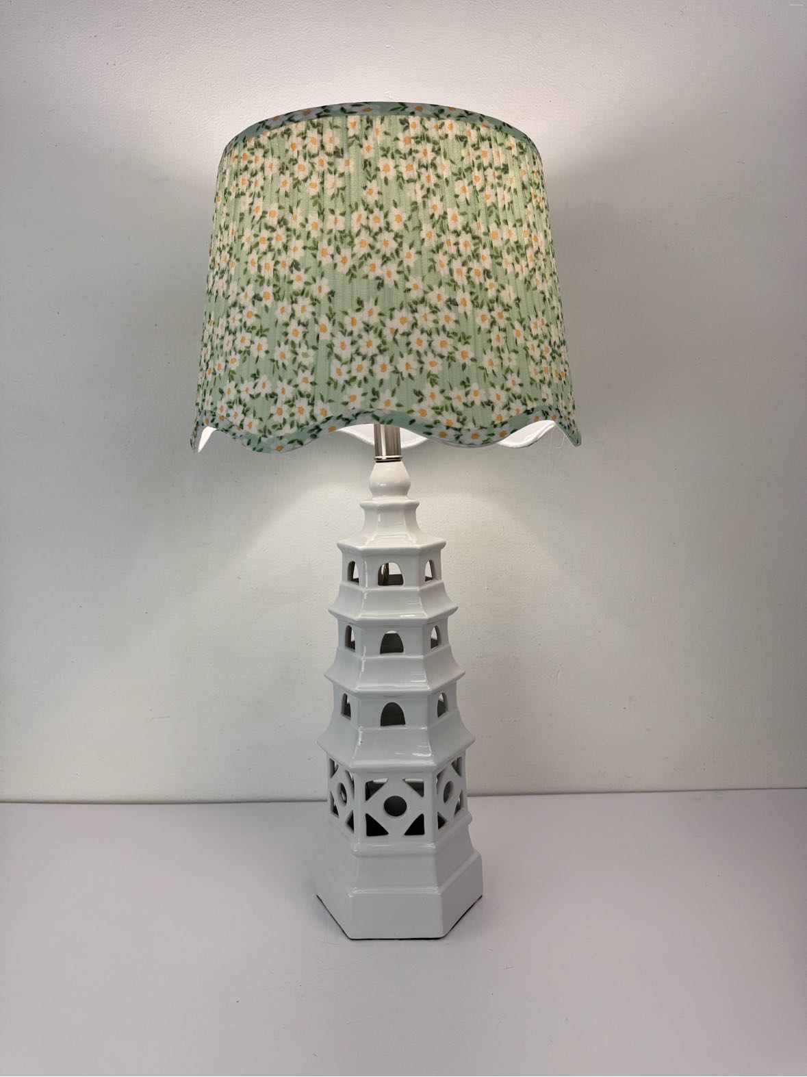 White ceramic pagoda lamp with cutout windows and a brand new green pleated floral shade with scalloped trim on the underside and a brass Asian finial. In excellent working condition.