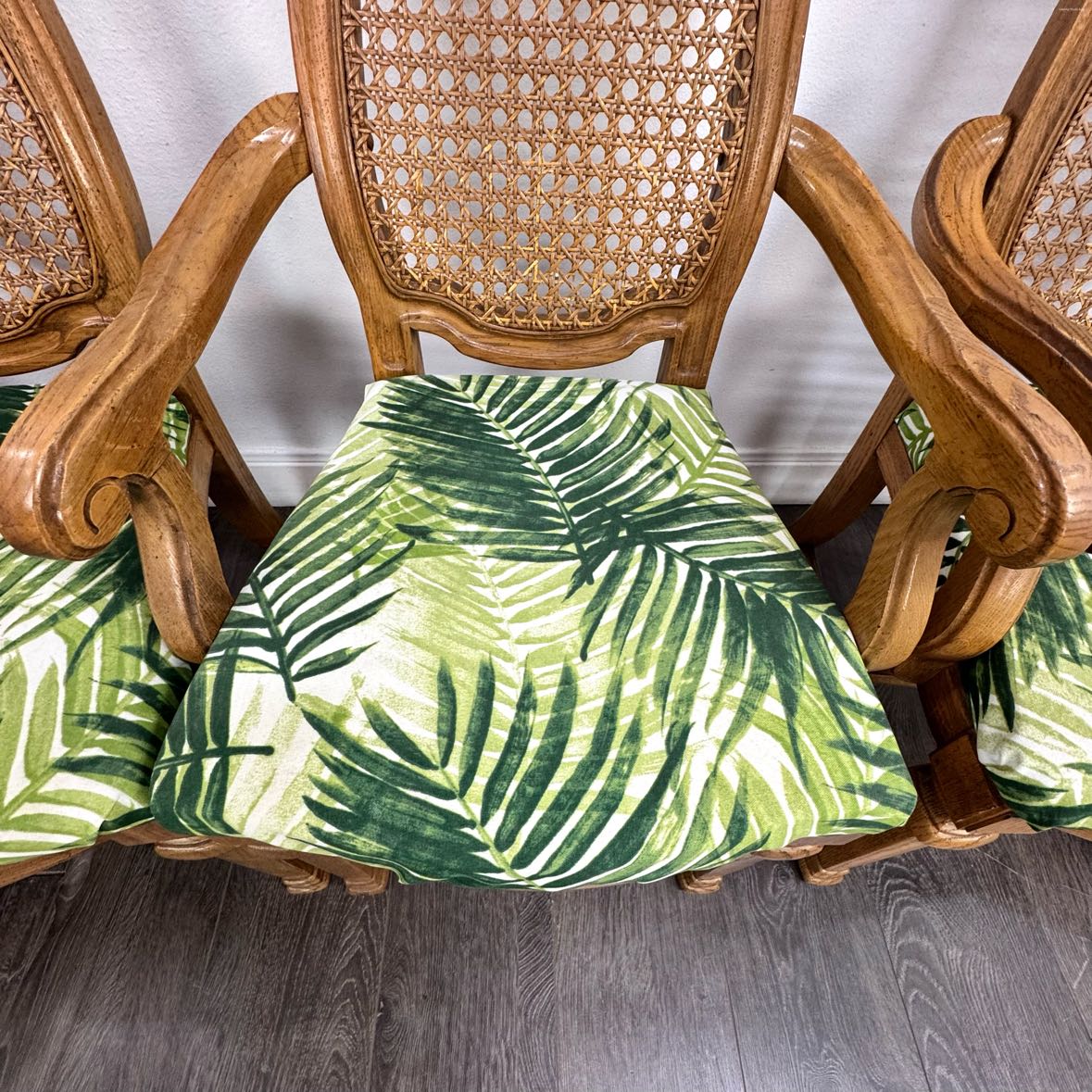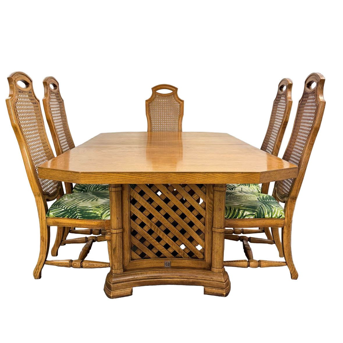 Dining set with a double pedestal lattice base, 2 high back arm chairs, and 4 high back side chairs. The leaves are not included. In overall very good vintage condition with some finish wear on the tabletop and the cane backs. Missing the table stretcher.