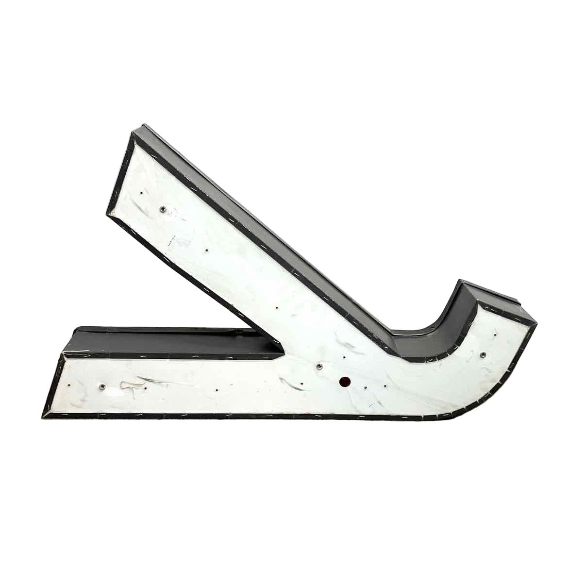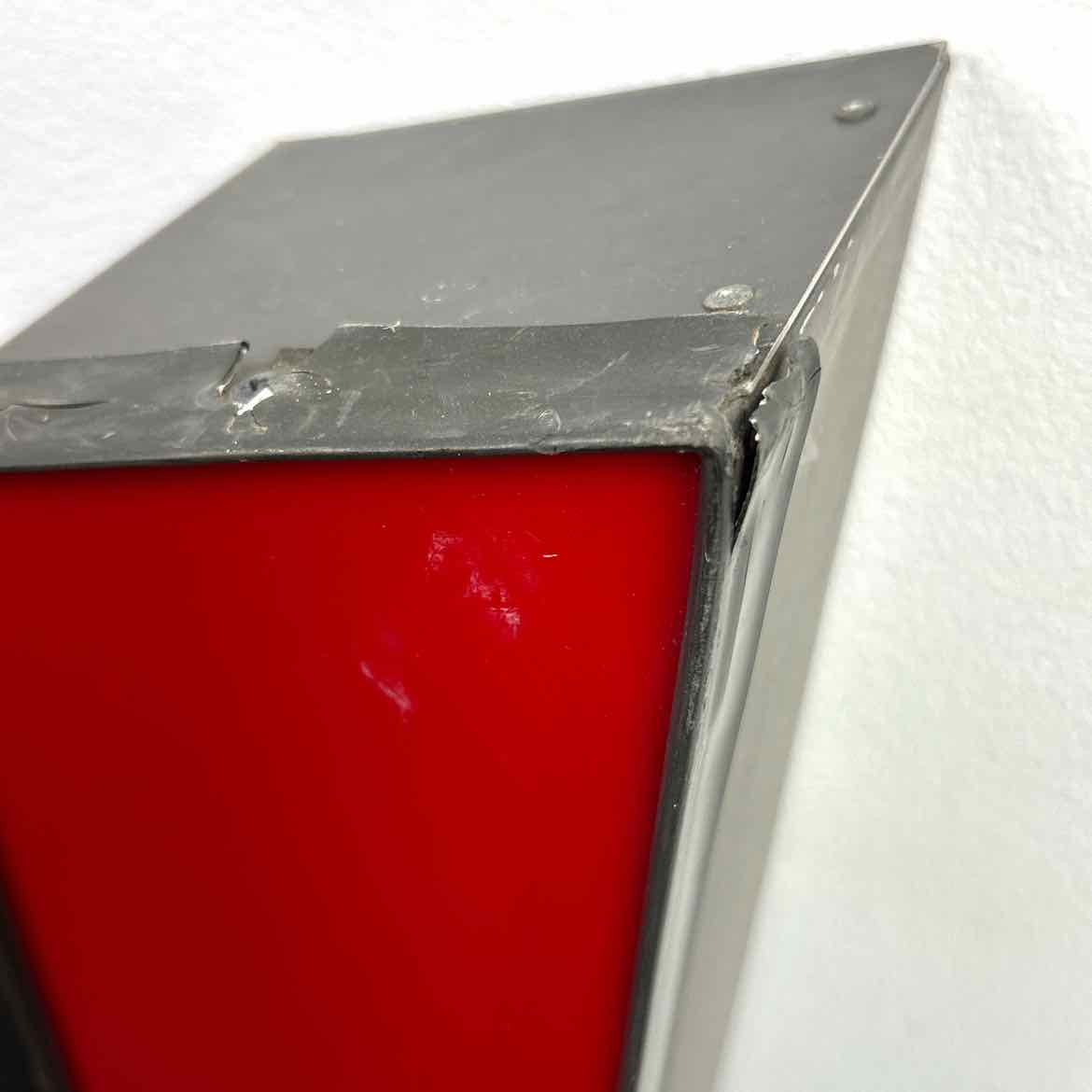 Reclaimed lowercase y channel letter with an aluminum metal frame in black and a plastic face in red. The outside has been cleaned and it's in good vintage condition. The front unscrews if you want to put lights inside.