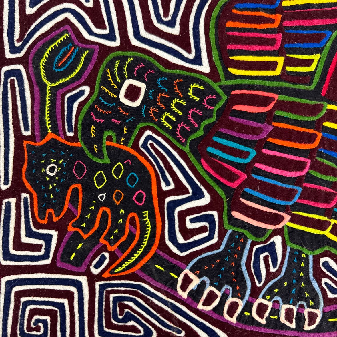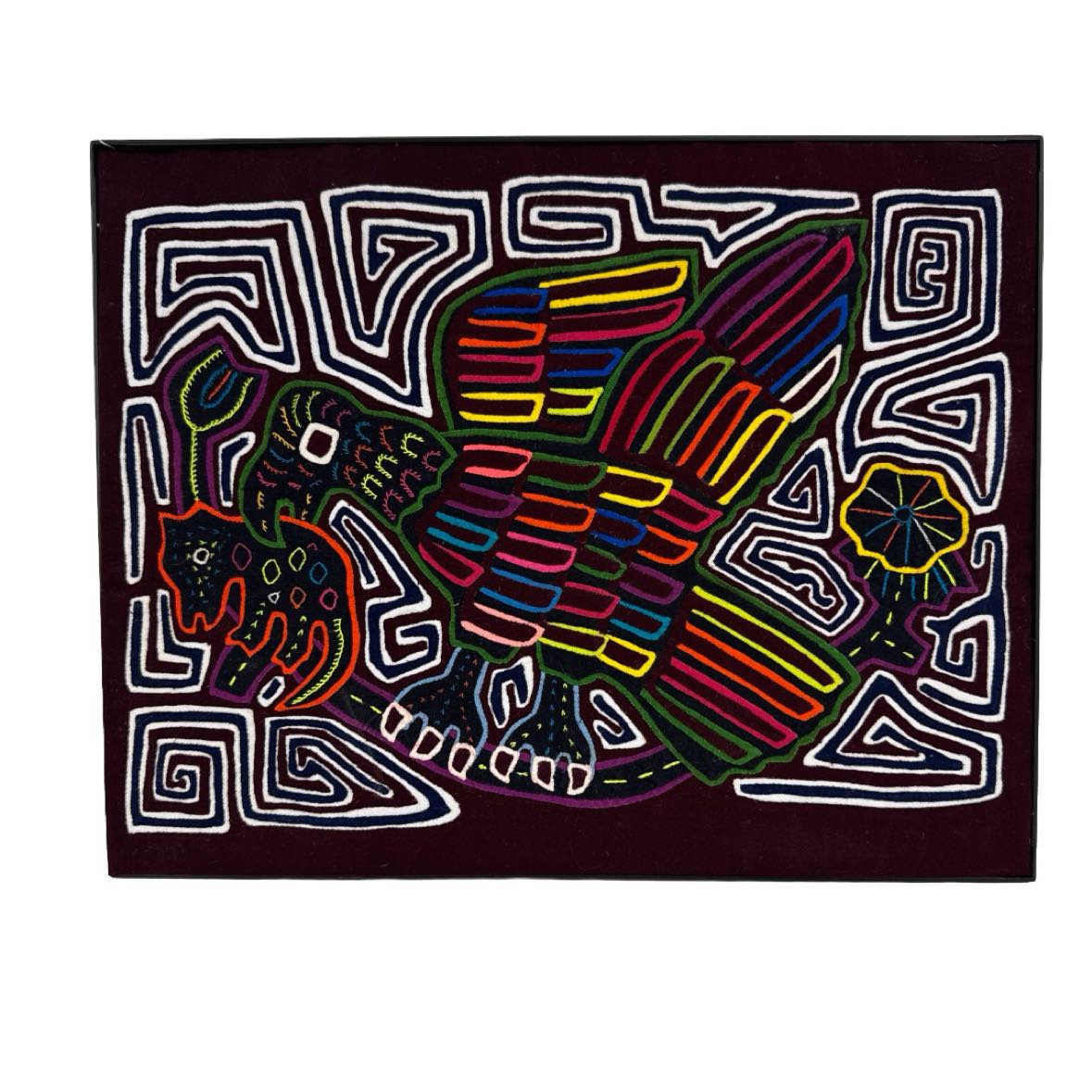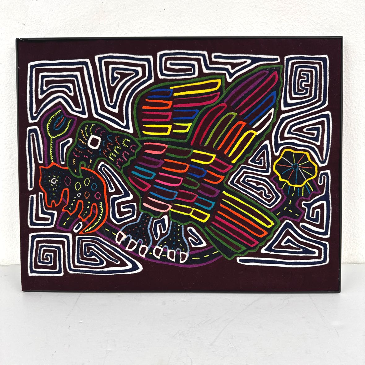 Small, beautiful and richly colored Kuna Mola tapestry, handmade in Panama, in excellent vintage condition. Features a bird of prey carrying its prey. The frame is cheap and plastic, nothing too special. Can be shipped folded if you prefer.