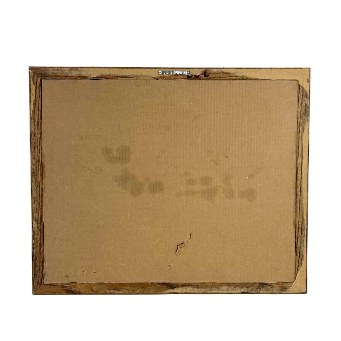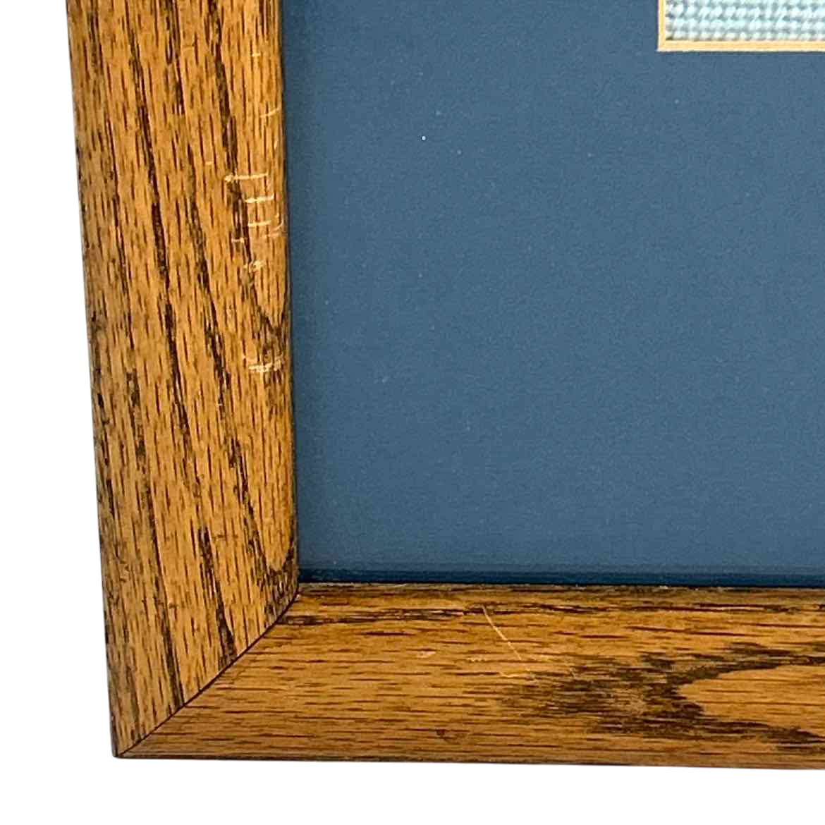 Framed "snow bunnies" needlepoint art signed Pam, with blue background and mat in a solid oak frame. The needlepoint has slipped just slightly in the frame, but it is in otherwise good vintage condition. The frame has a sawtooth hanger.