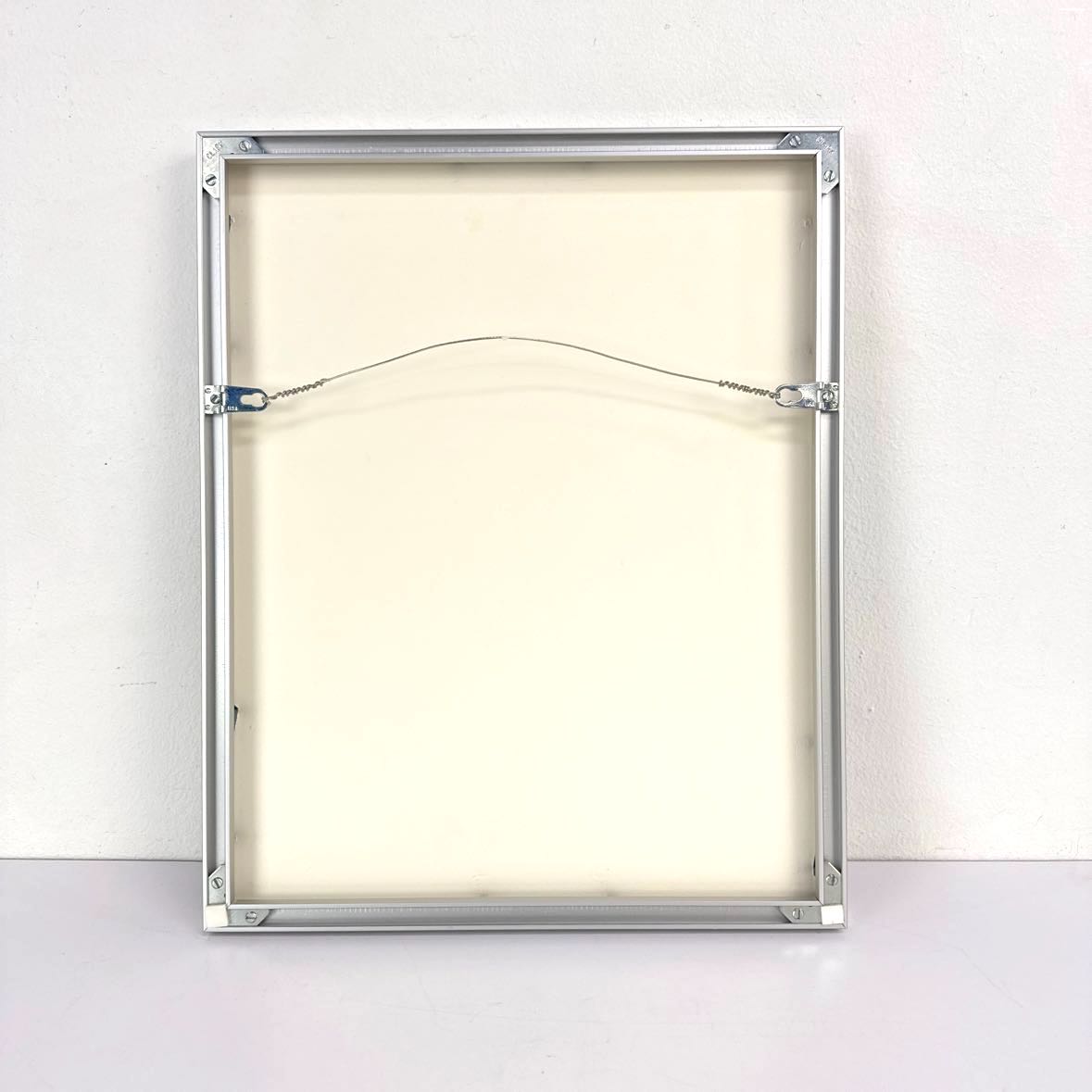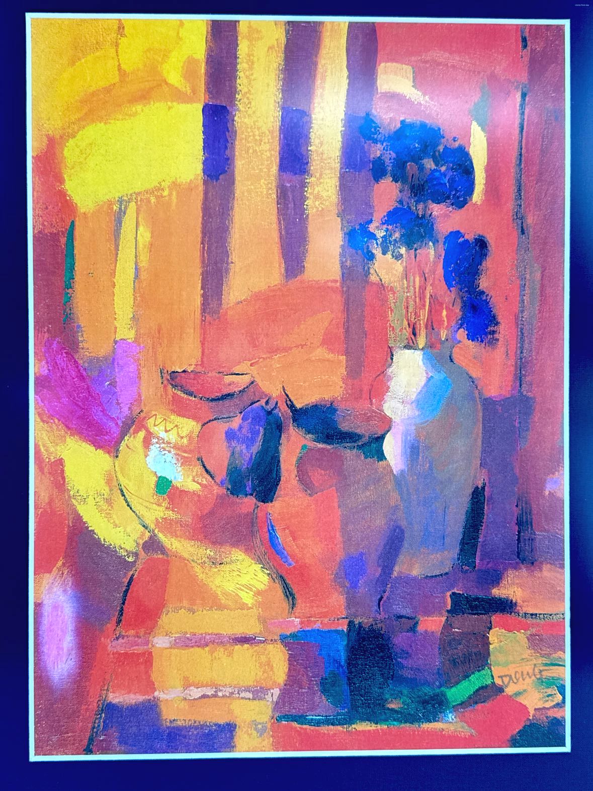 Framed abstract floral still life print in bold orange and purple with a purple mat and modern silver toned metal frame. Ready to hang with a wire, professionally finished in the back.