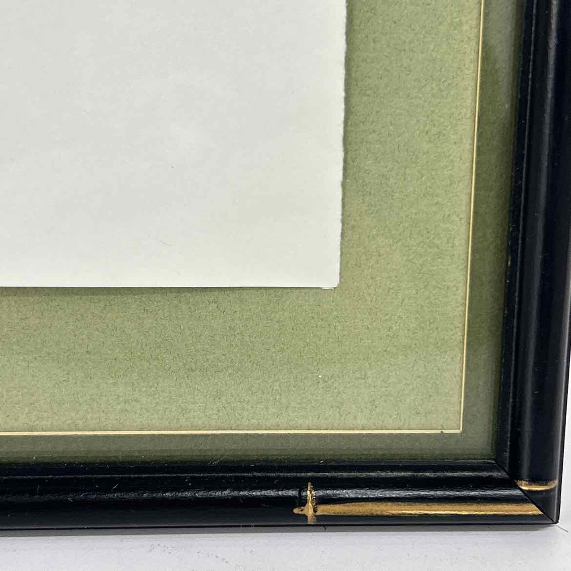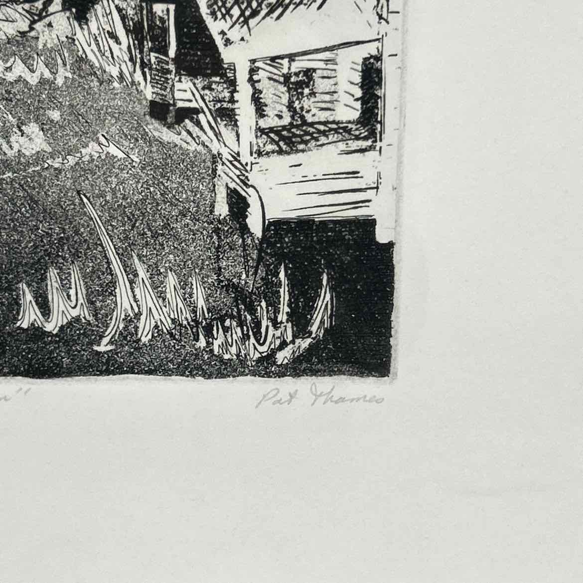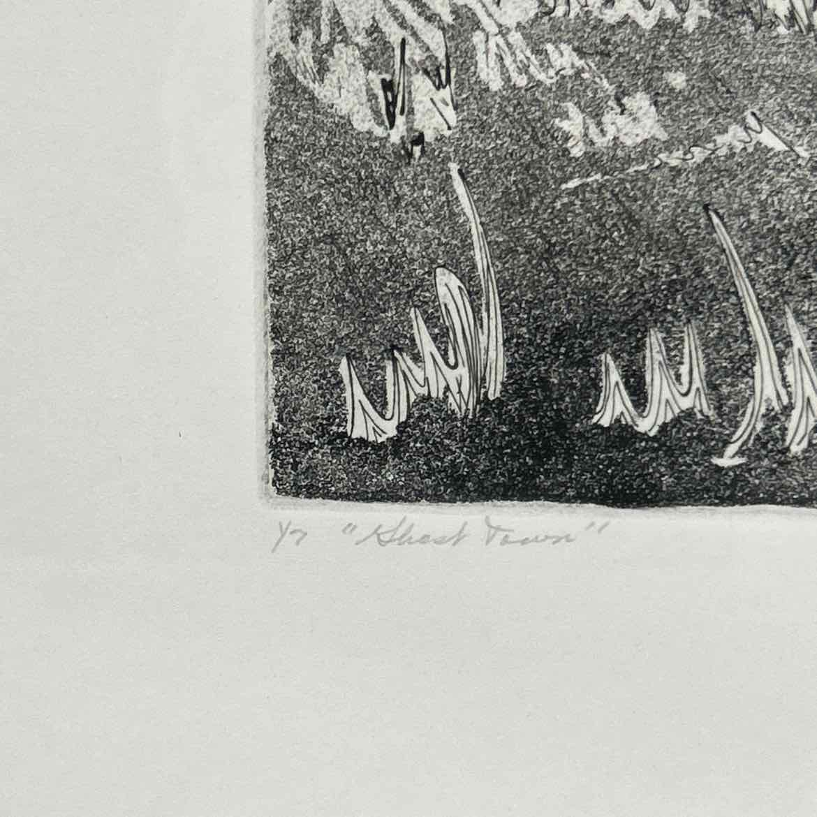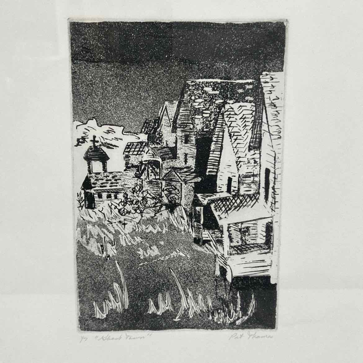 Professionally framed lithograph or intaglio print titled "Ghost Town" by Midland, Texas artist Pat Thames, with a black faux bamboo frame. The art paper with deckled edges are mounted over a green mat. Excellent vintage condition.