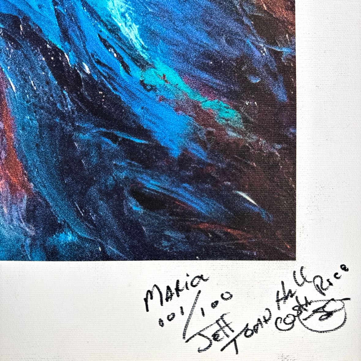 This unstretched signed and numbered limited edition print of a bold orange & blue horse painting by artist Marcia Baldwin. Signed 001/100. In very good vintage condition with some discoloration on the back side. Art measures 19.5" square.