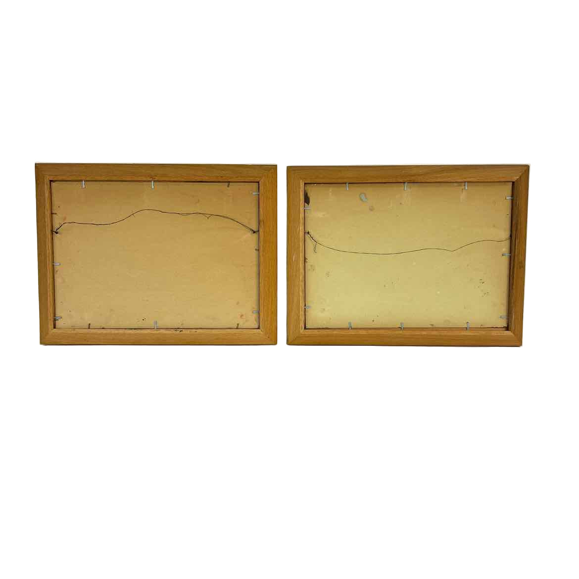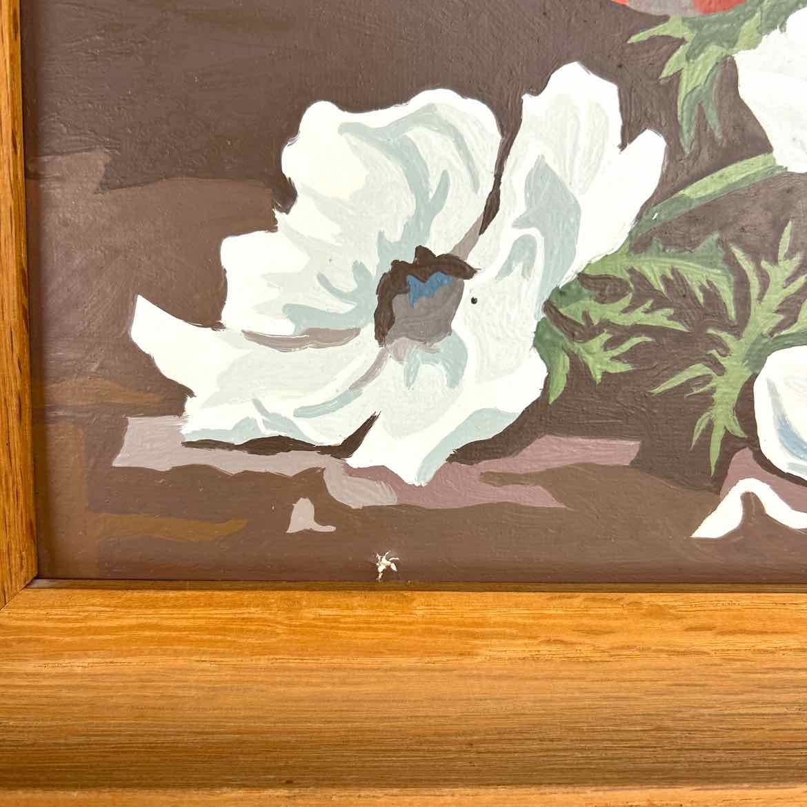 PAIR framed paint by number floral still life paintings of poppies with solid oak wooden frames. They hang on wires and are unfinished on the back. One has two small areas of damage from the mounting nails as shown.