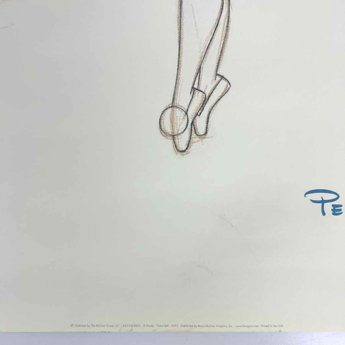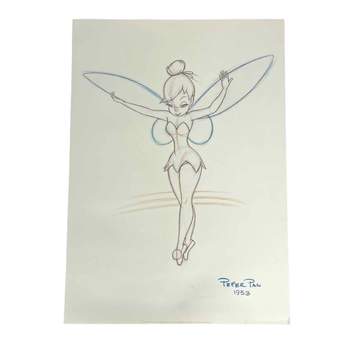 Vintage reproduction poster print of a Tinkerbell sketch from Disney Studios, in good vintage condition with some light wear from age around the edges. Signed 1953, the poster is printed more recently since there is a website printed on the bottom.