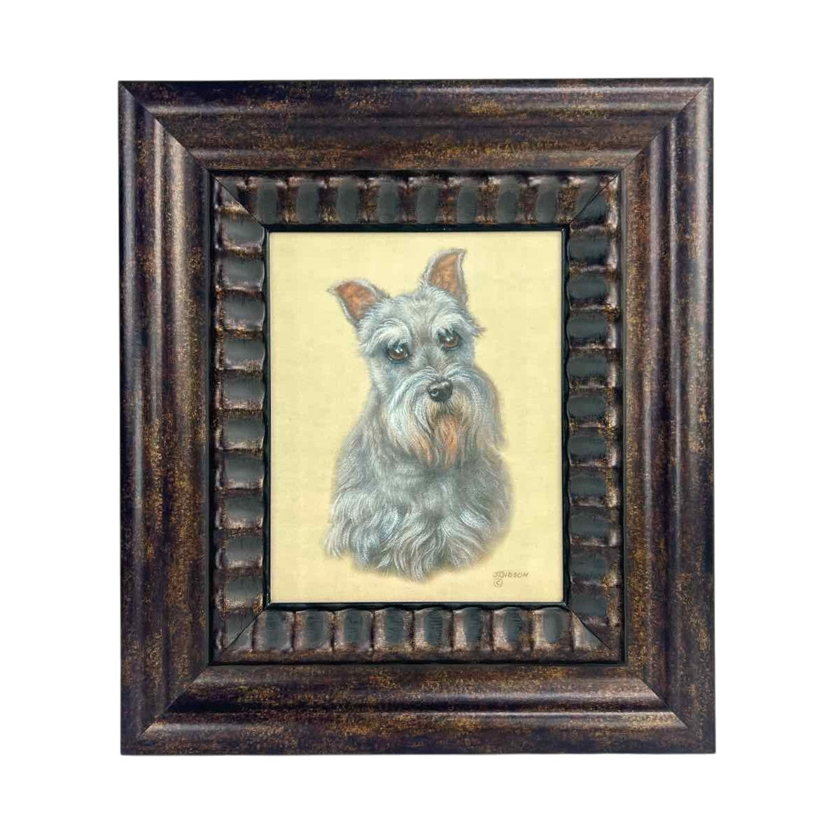 Professionally framed schnauzer dog print from artist Judy Gibson that looks almost like a real painting, with a thick dark wood look frame. Hangs with a wire, in excellent vintage condition.