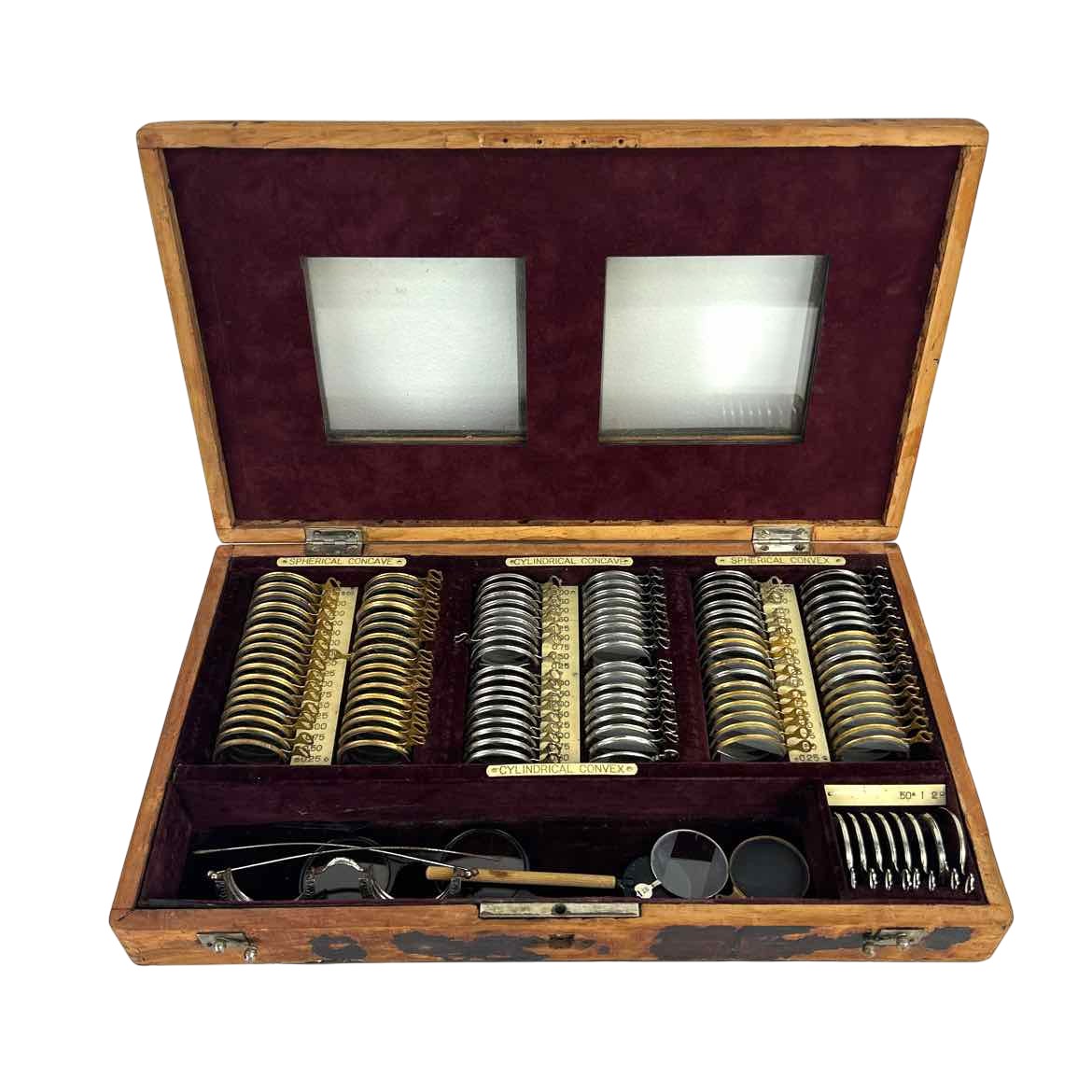 Antique ophthalmic equipment trial lens exam set kit traveling case in good vintage condition considering it dates back to the 1920s or 1930s. A couple of the lenses are broken, and the box has some wear and missing latches. See photos.