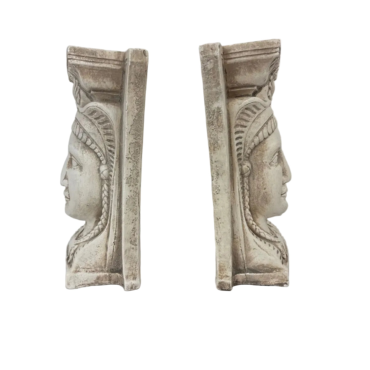 PAIR large plaster bookends with Egyptian woman faces and architectural details. The white plaster has texture and color variation added to give it an old world look. Excellent vintage condition.
