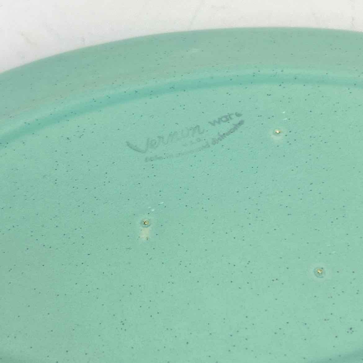 Vernonware Anytime is a mid-century modern dinnerware pattern made by Vernon Kilns (later acquired by Metlox) in California, popular between 1956 and 1965. The line is known for its abstract, atomic-style designs, often featuring stripes and geometric shapes in colors like aqua, yellow, and gray.