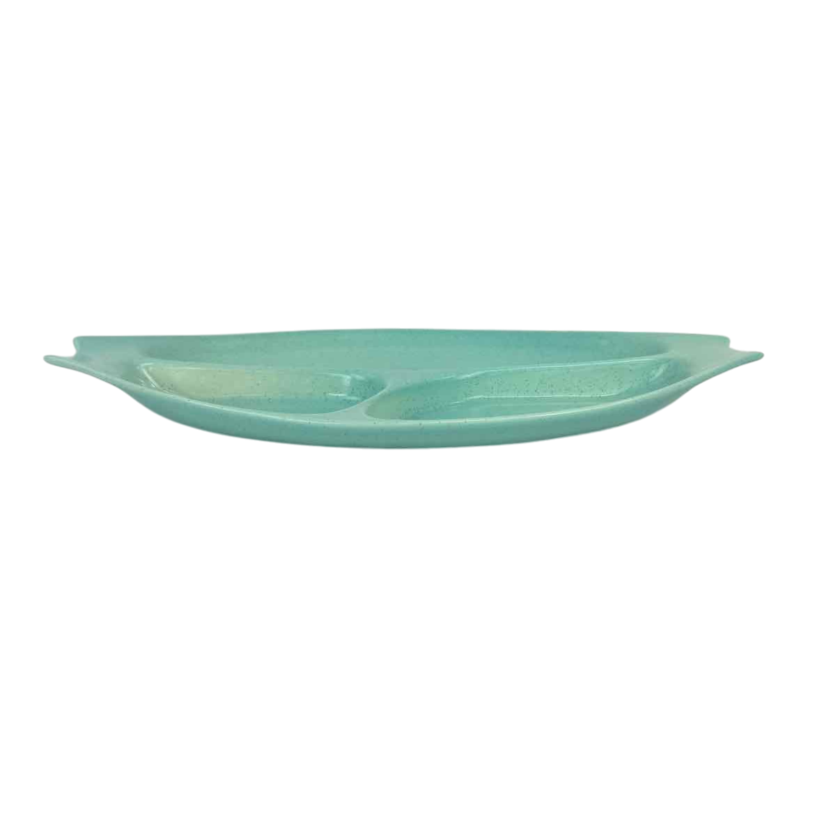 Collectible mid-century modern divided serving platter made of turquoise pottery with a nice organic shape. In excellent vintage condition and perfect for charcuterie!
