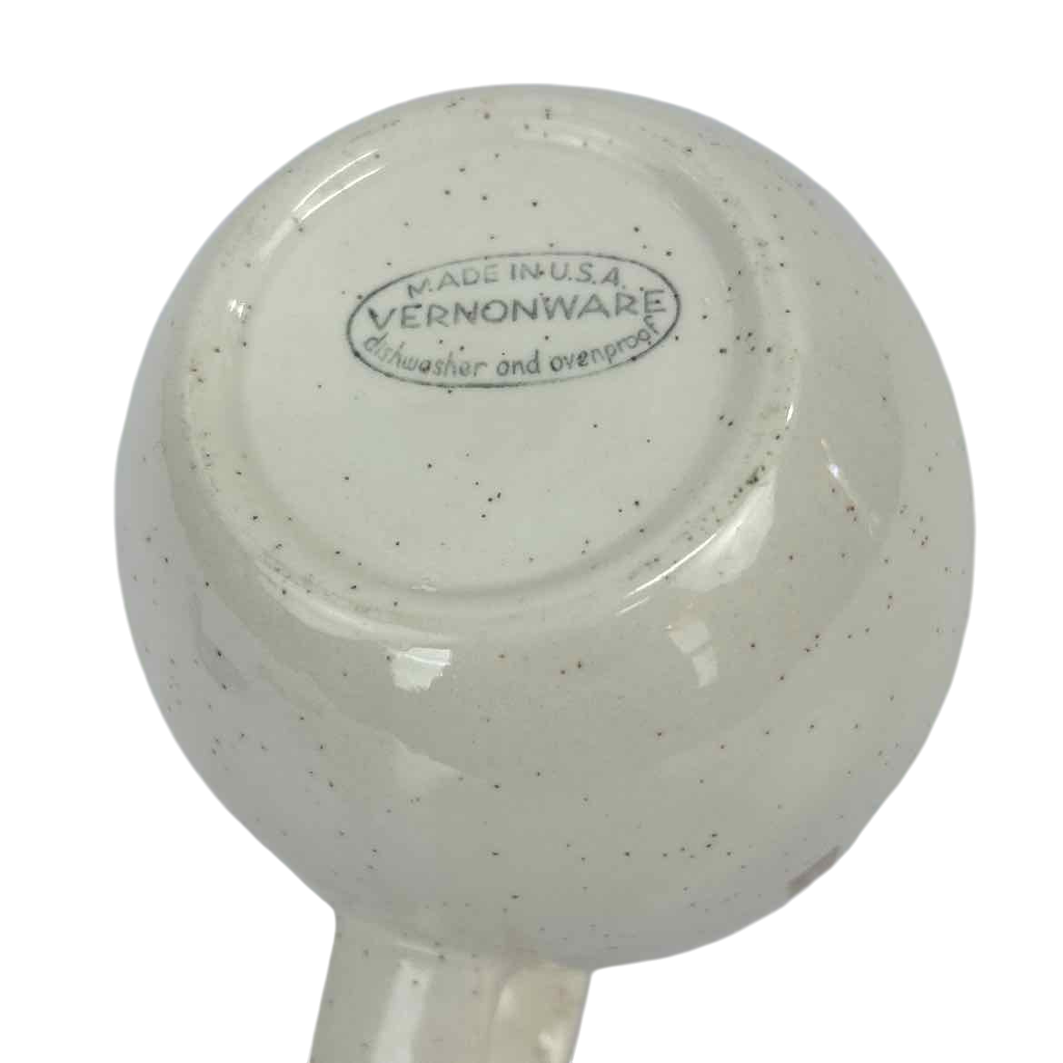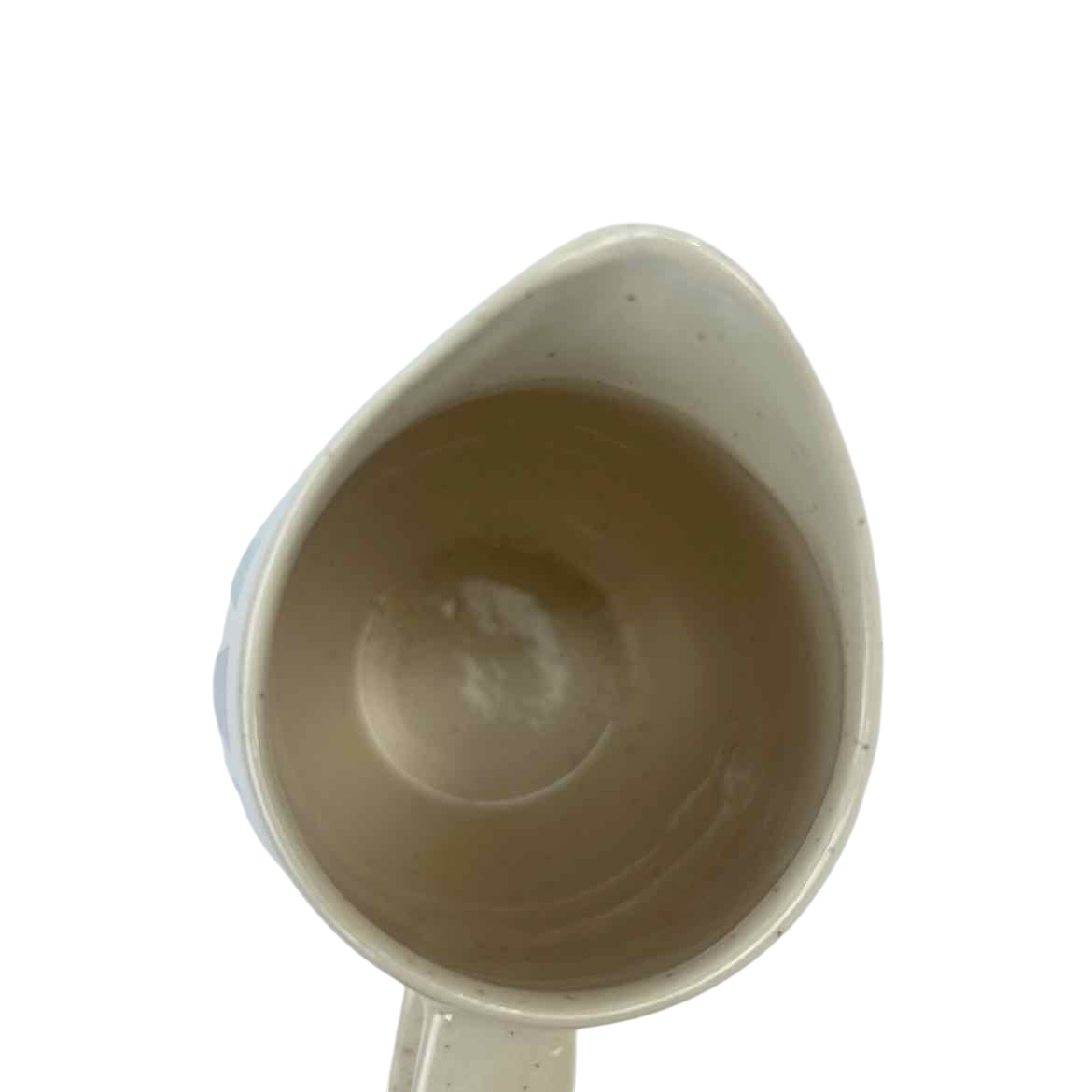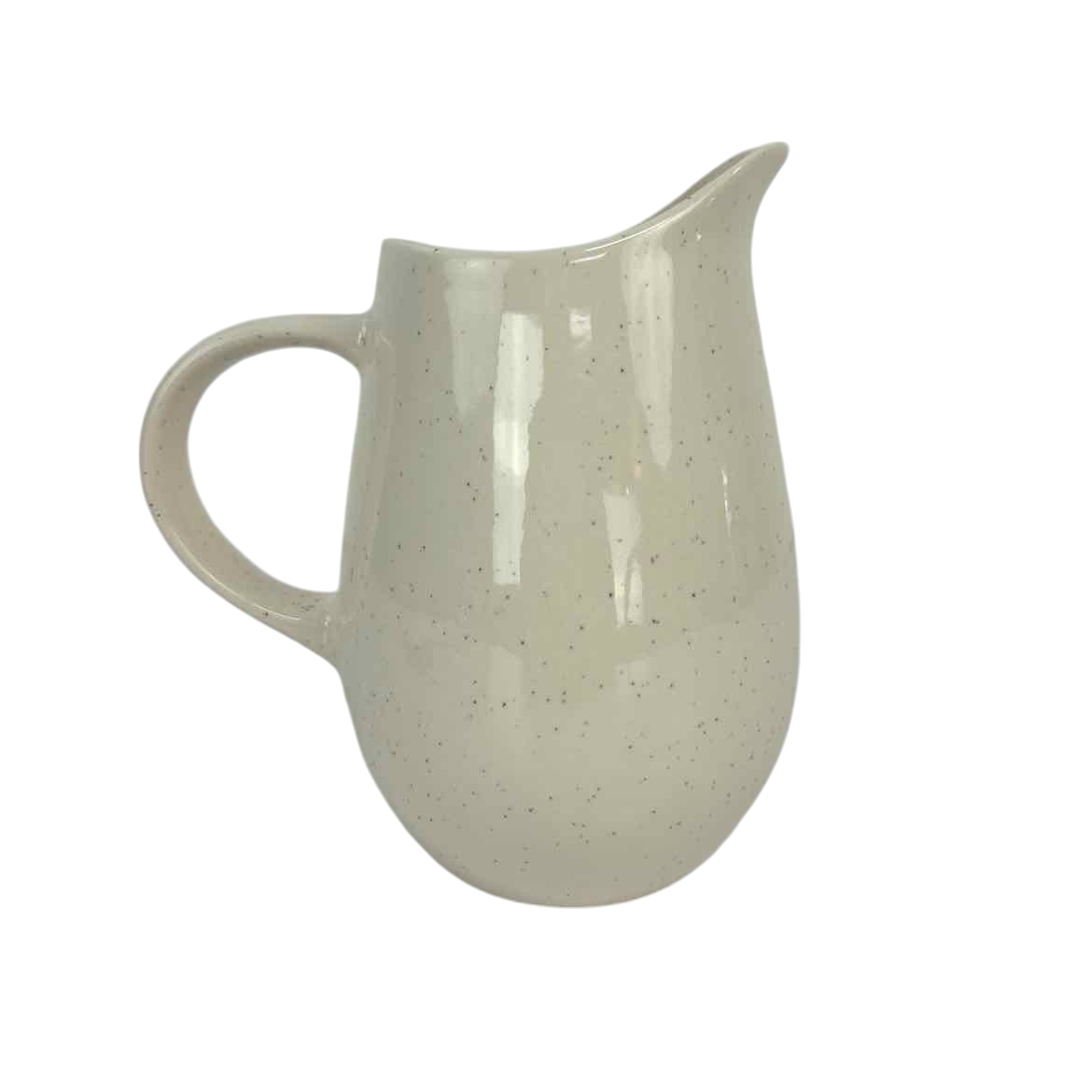 Collectible mid-century modern small pitcher made of speckled ivory pottery with atomic stripe design.