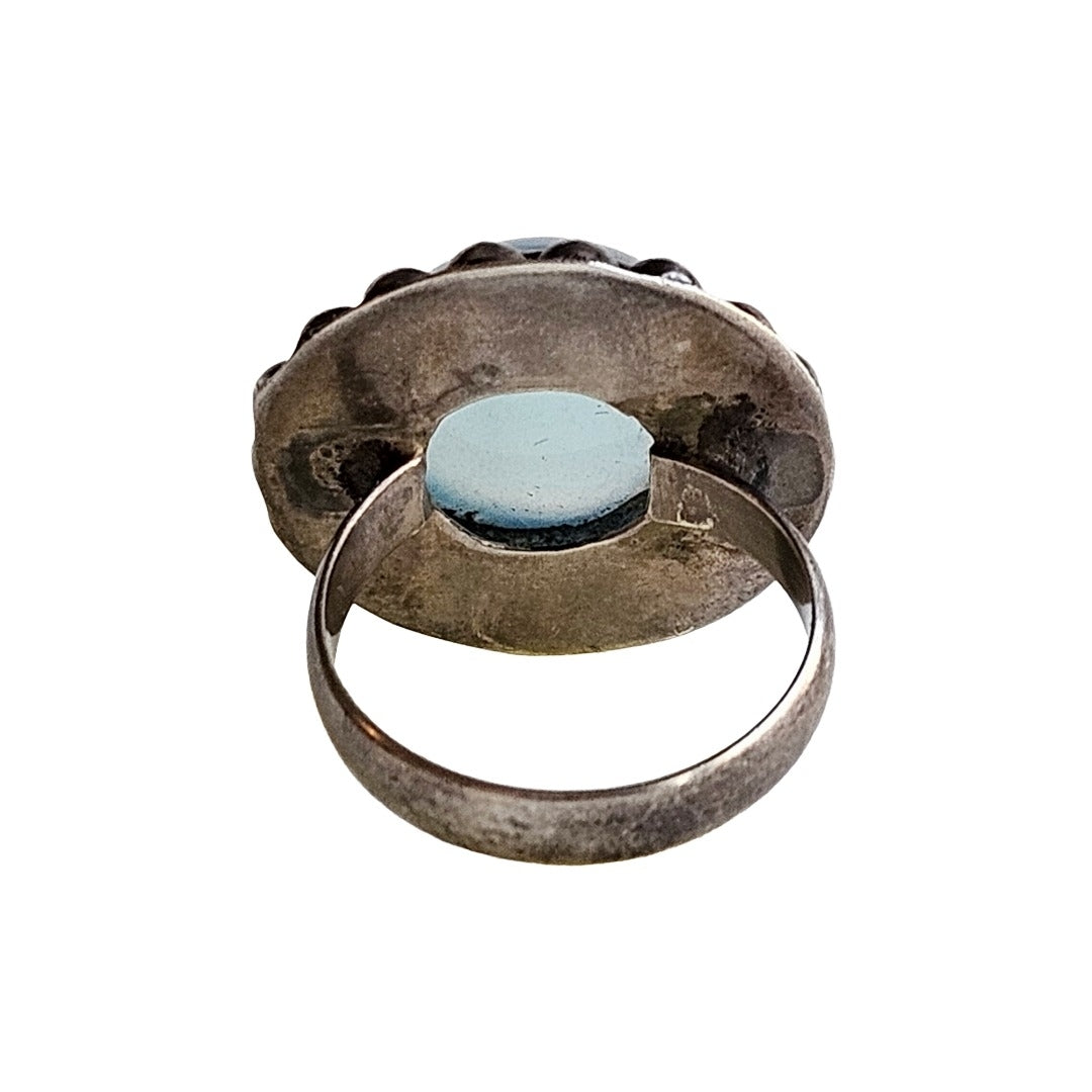 Large sterling silver statement ring with beaded trim around a large blue chalcedony cabochon, in excellent vintage condition and stamped 925.