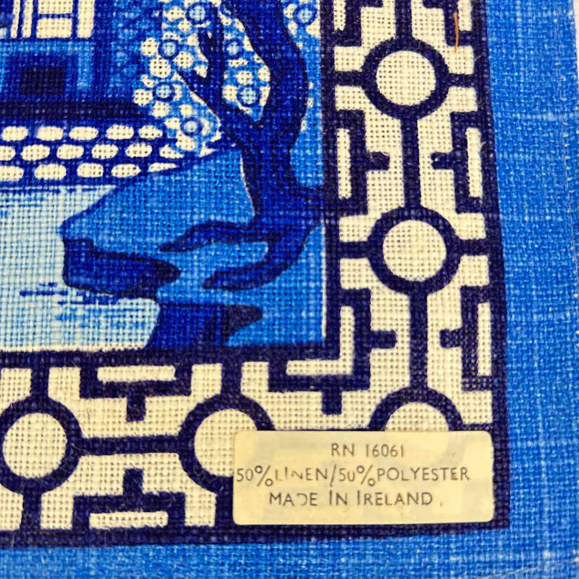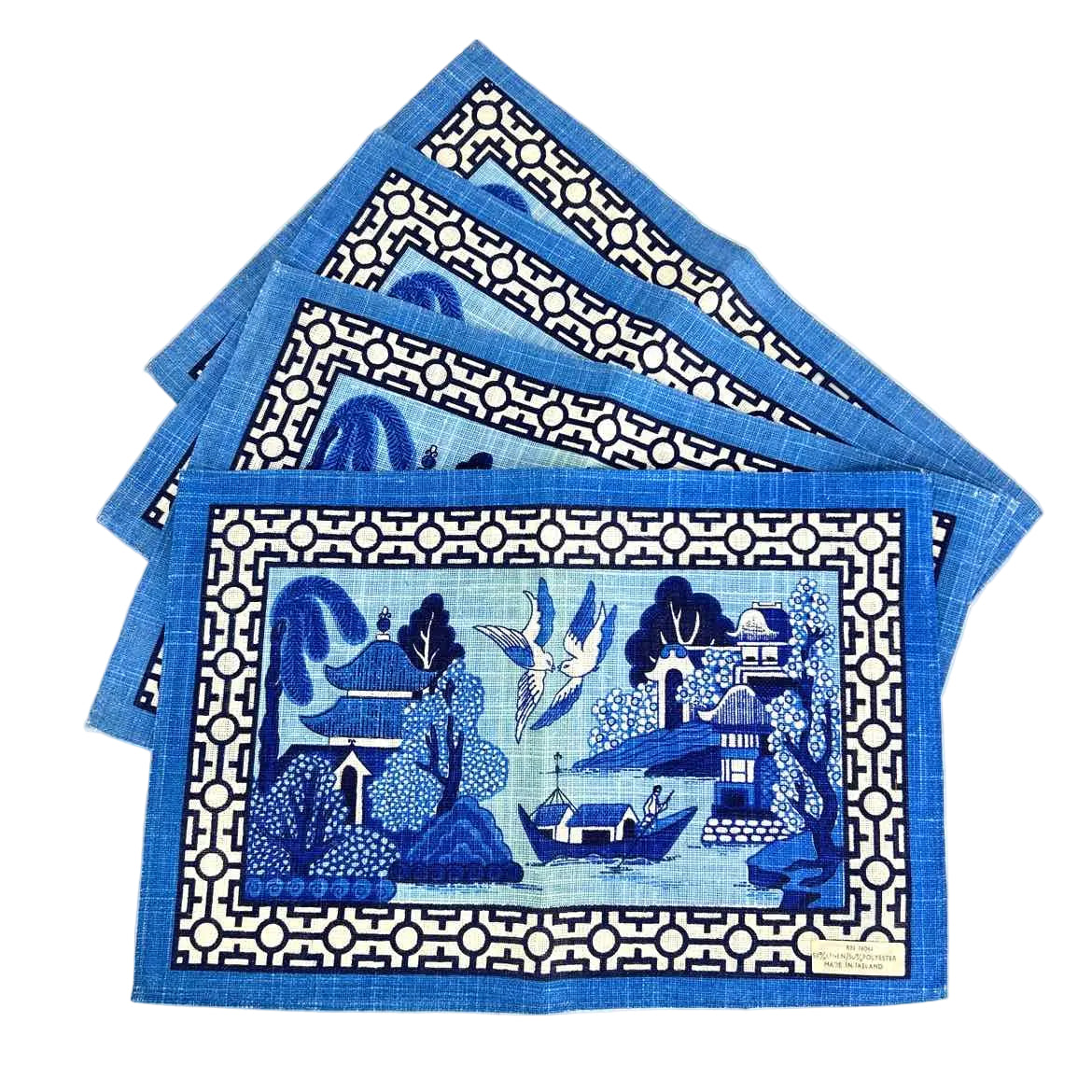 SET/4 blue & white chinoiserie placemats made in Ireland of all places, in fairly good vintage condition but with some sun fading/yellowing on the creases from storage as shown.