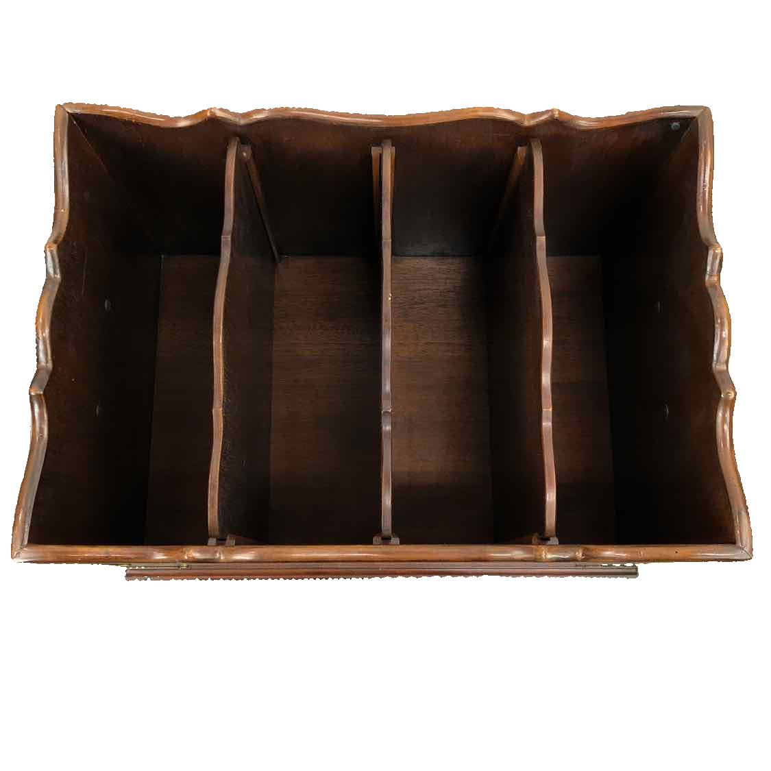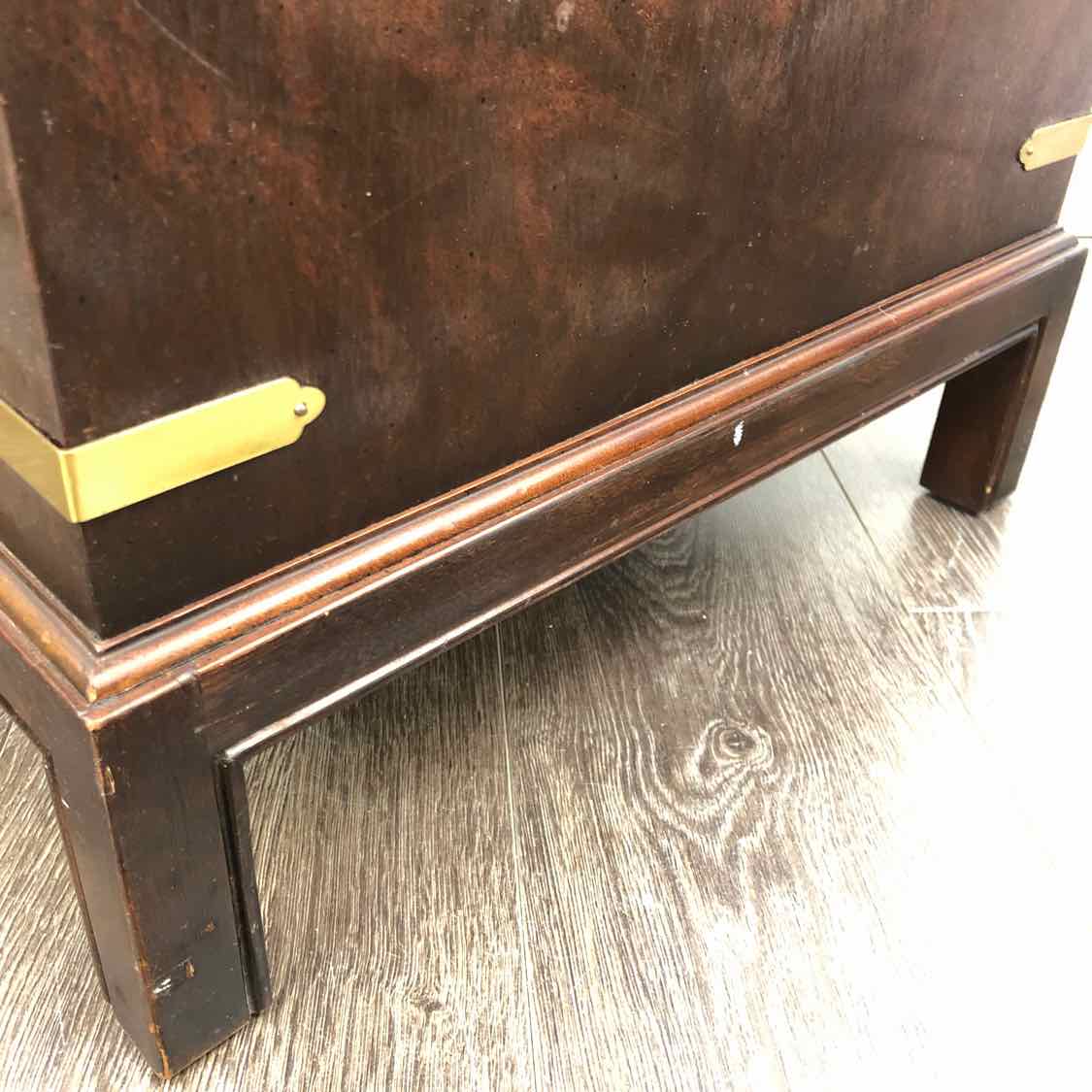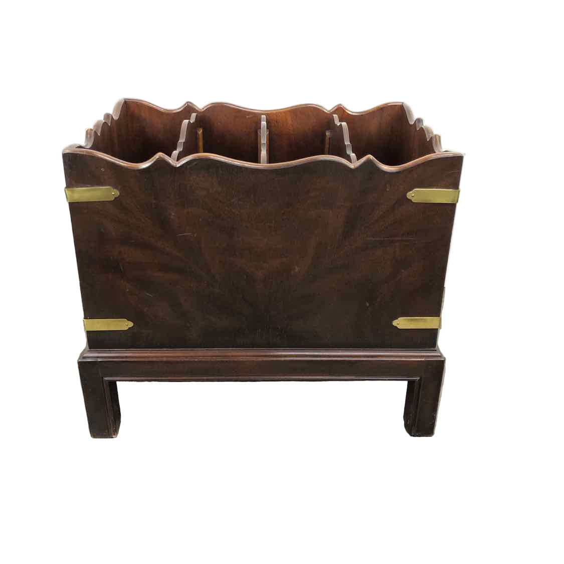 Asian campaign style organizer rack for books or magazines, made of dark stained wood with brass details and handles on the sides. In excellent vintage condition, made by Drexel in the USA.