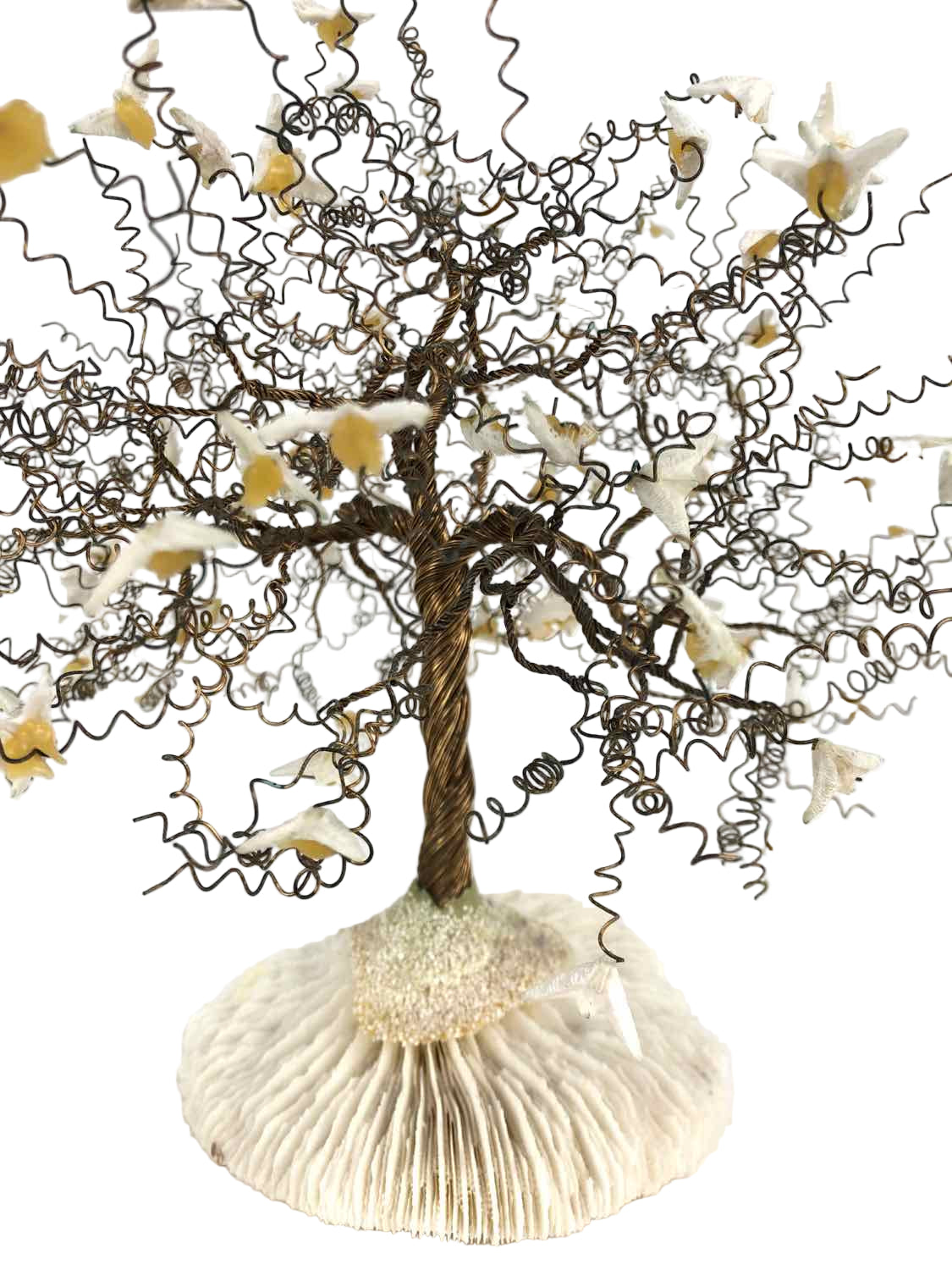 Handmade brass wire coil tree with coral base and "birds" made from the interior bones of a sand dollar. In very good vintage condition and clean, a beautiful piece to add some natural texture.