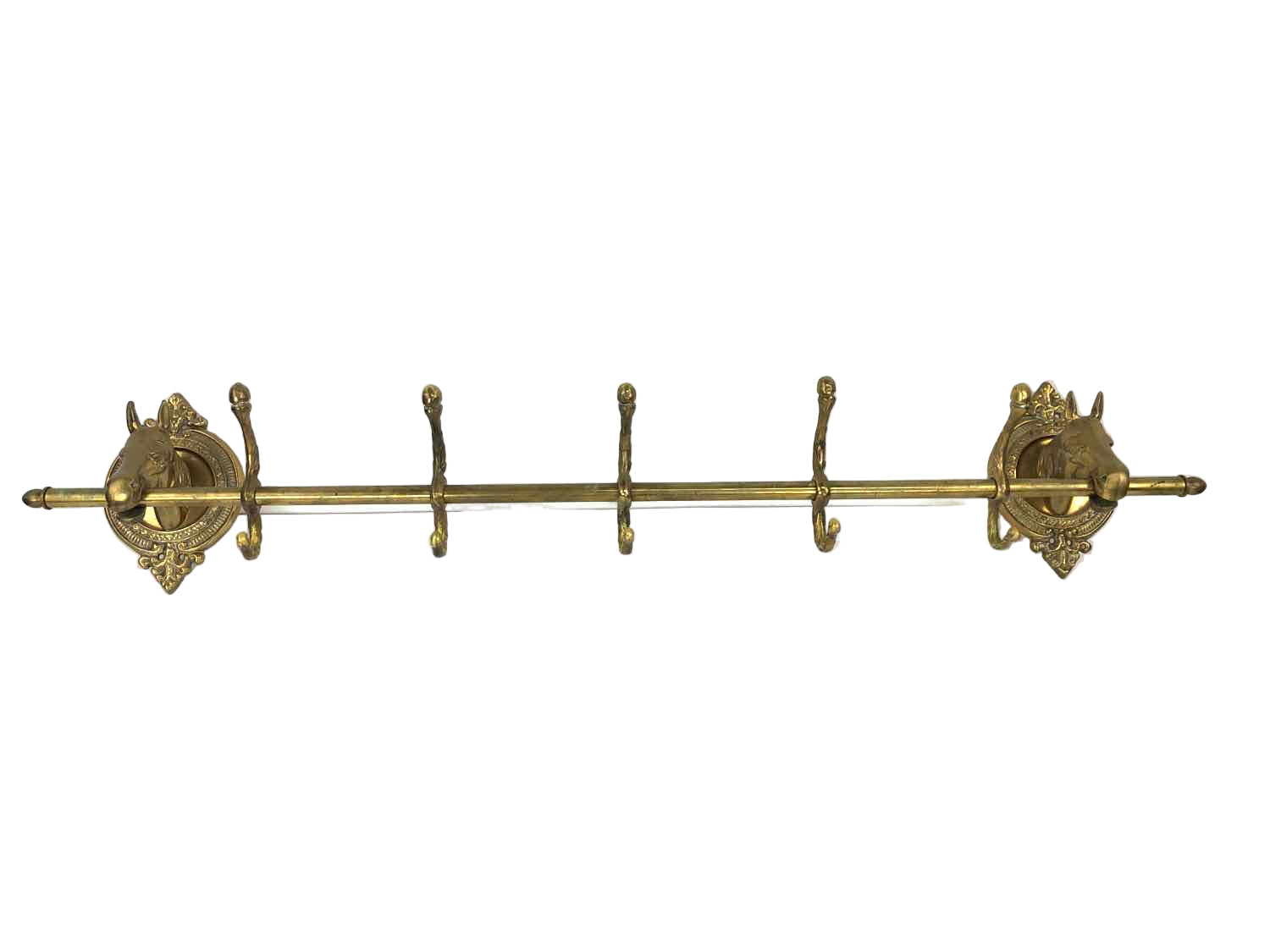 Rare solid brass wall coat rack with detailed horse heads on either end, in excellent vintage condition with some light patina. Mounting screws not included. Such a highly collectible piece for a Ralph Lauren style space or an equestrian lover.