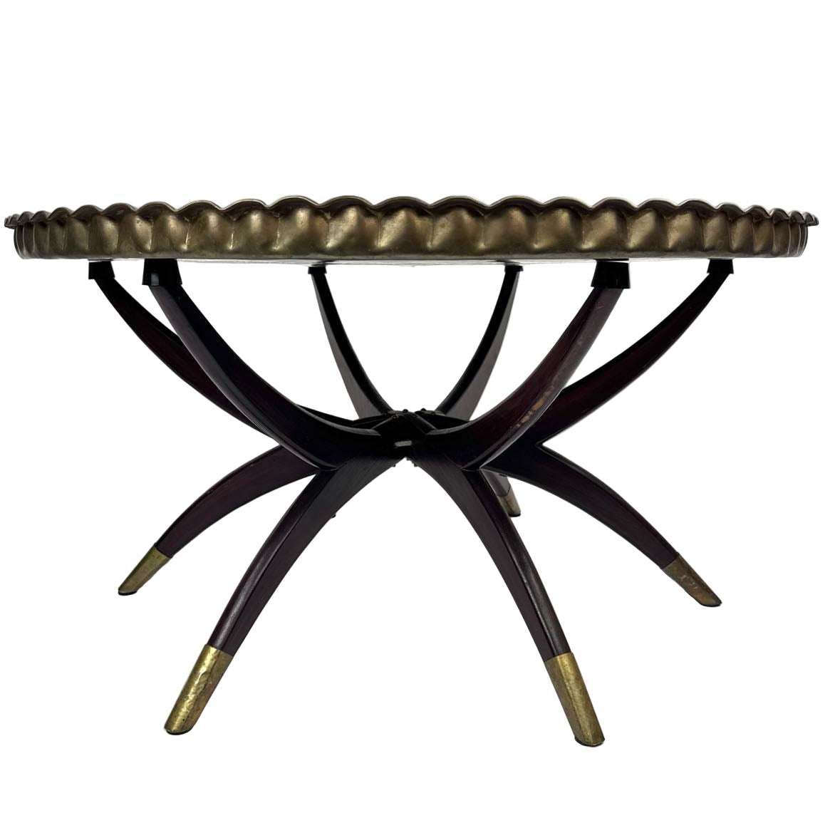 Large Moroccan pie crust brass tray table with folding spider leg base with brass ferrules. The tray has nice details, the base is sturdy with freshly replaced rubber stoppers. The base folds up for storage when not in use. Contact for shipping.