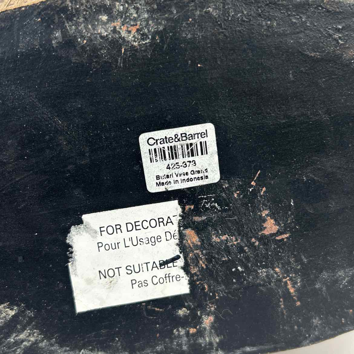 Large wooden Butari vase by Crate & Barrel, in overall good vintage condition with some light fraying. The outer fibrous bark exterior adds nice texture to a space, and it is study. The interior is black. The inner material might not be wood.