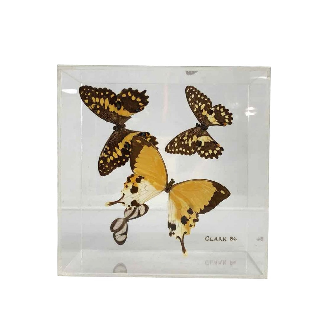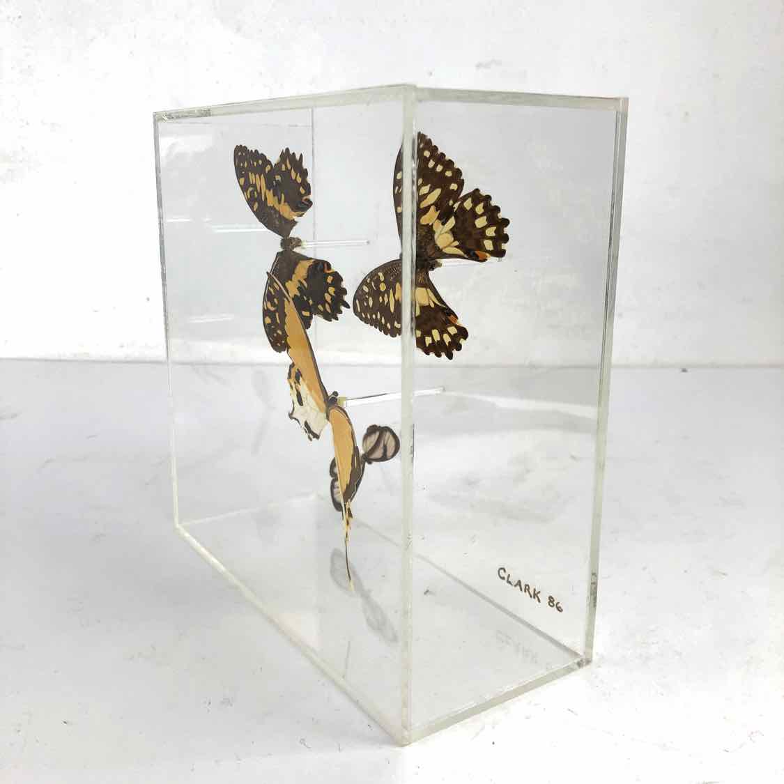 Lucite box with four brown and yellow butterfly specimens in it, signed Clark 86 in the lower corner. In excellent vintage condition with some light wear from age. Local pickup preferred as the item is very delicate.