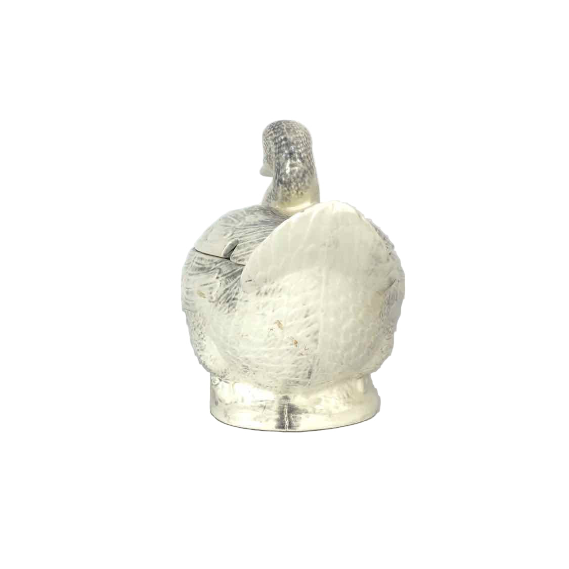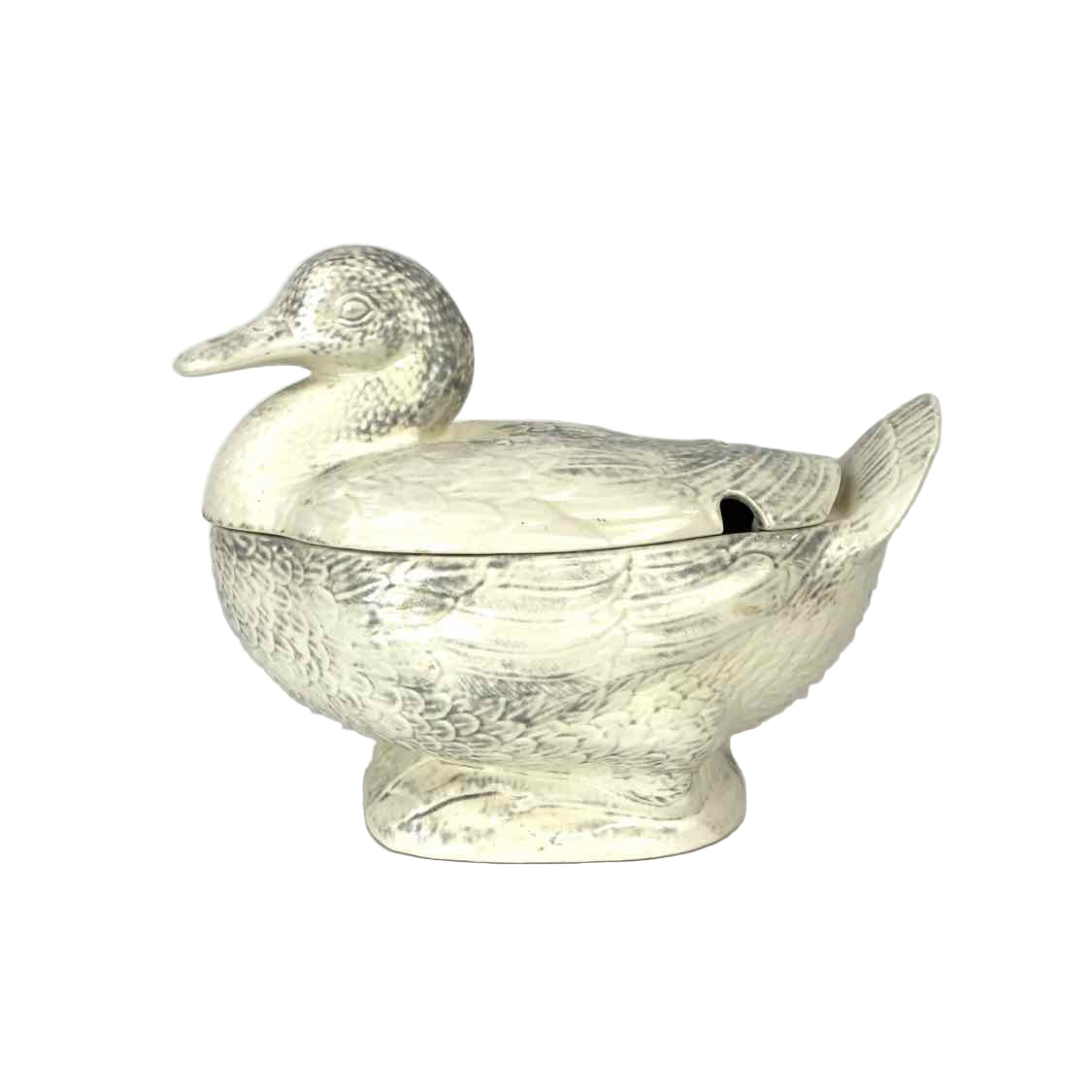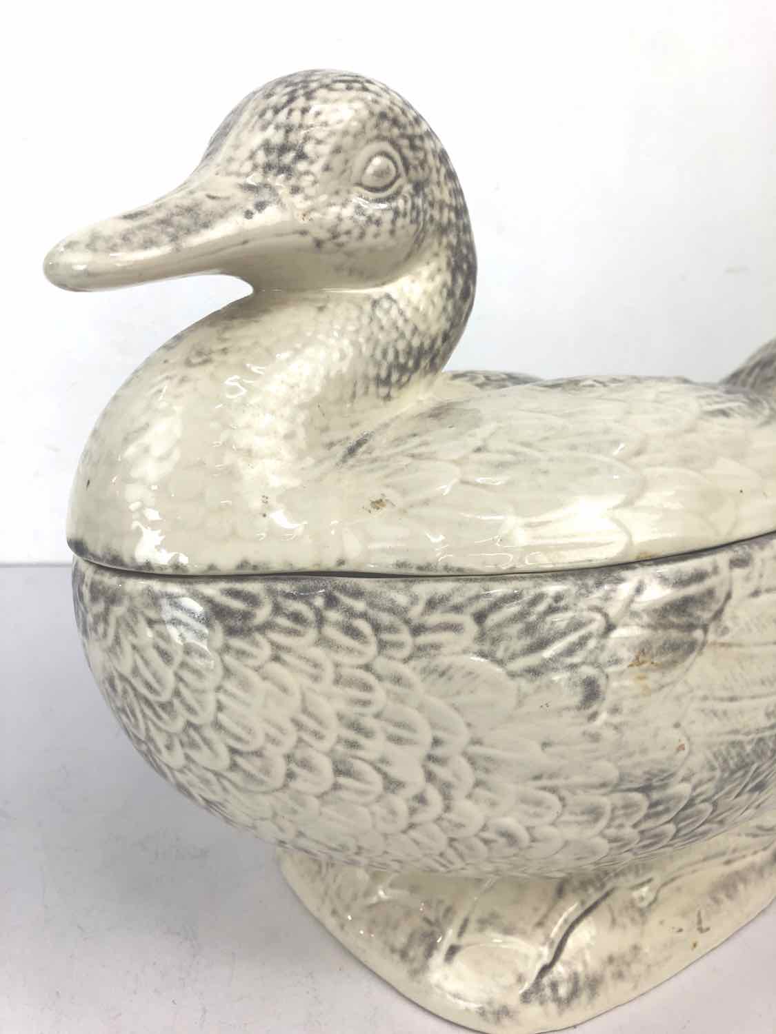 Large duck soup tureen made of white ceramic with gray textured glaze, in good vintage condition although there is a small crack on the underside that might mean it's best for decorative use only.