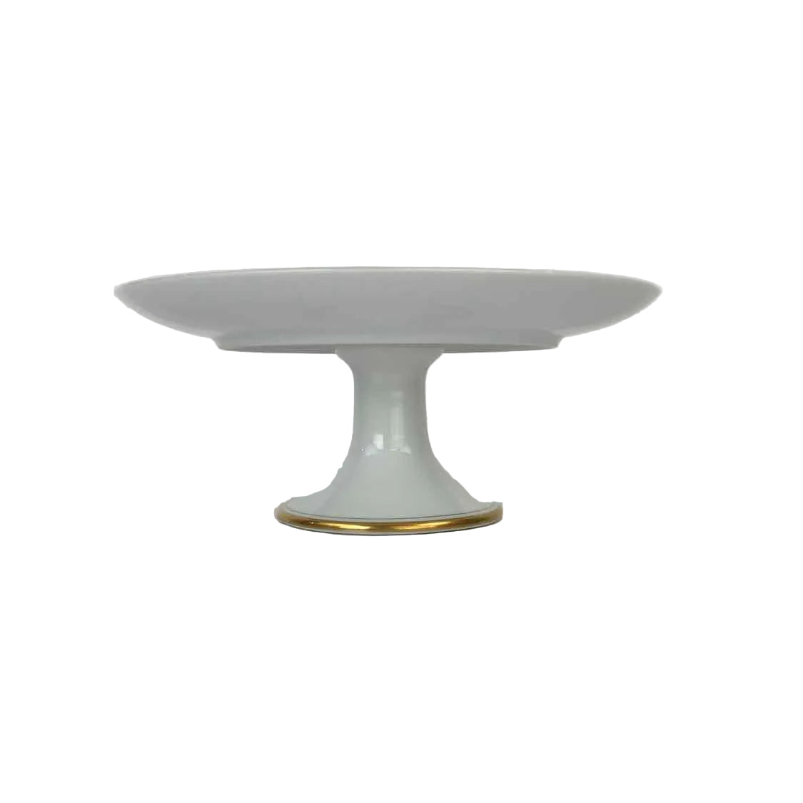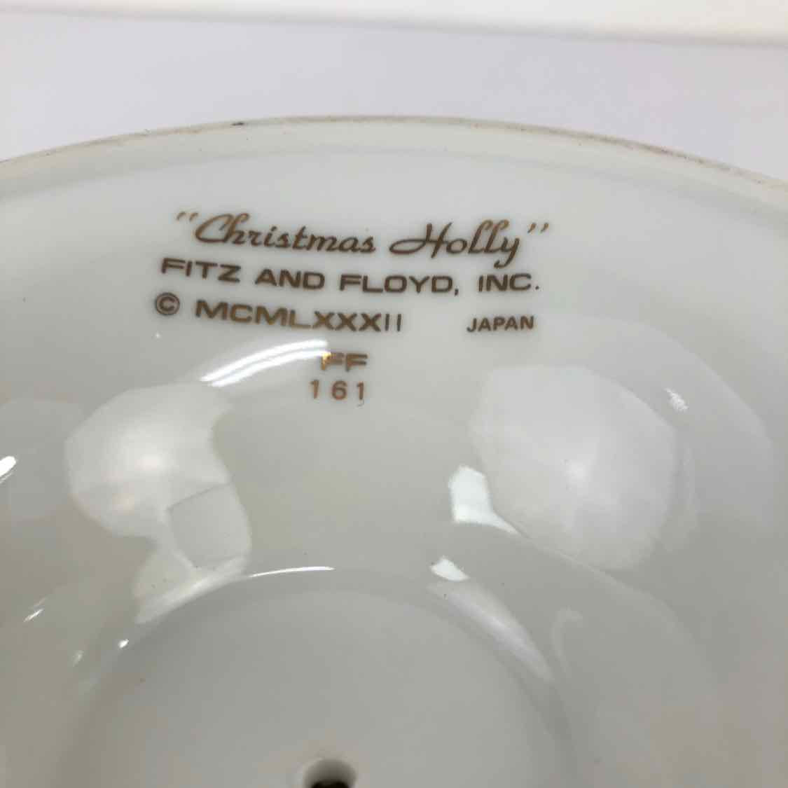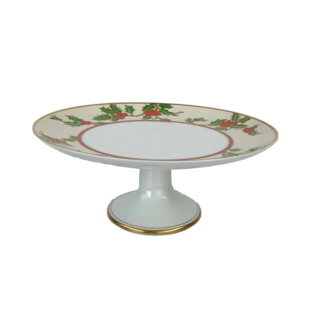 Get pot luck ready with this Christmas Holly cake stand with a pedestal base by Fitz & Floyd with red berries & band, holly, cream/white and metallic gold details, in excellent vintage condition. This discontinued pattern was made from 1984-1991.