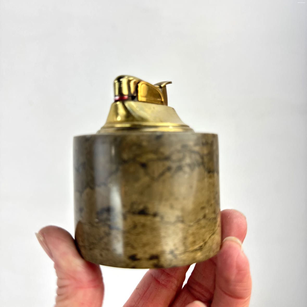 Vintage oil well core sample stone table lighter with a nice dark gray body, gold lighter at the top and remnants of a felt liner on the underside. Excellent vintage condition, no fluid. Lighter made in USA.