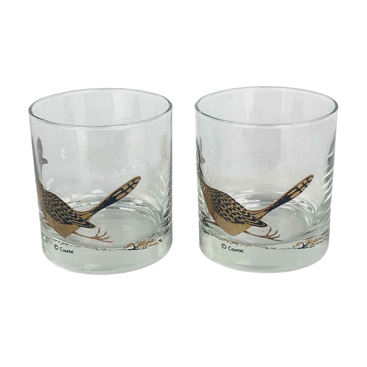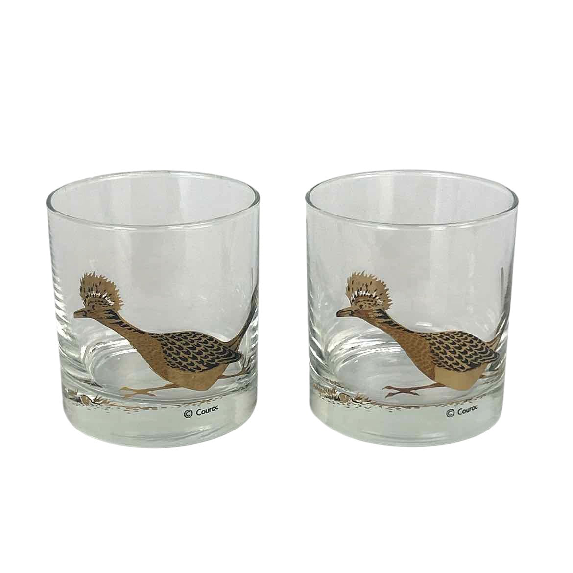 PAIR rare and collectible roadrunner bird glasses from Couroc, the finest mid-century lowball glasses with 24K gold designs. In excellent vintage condition.