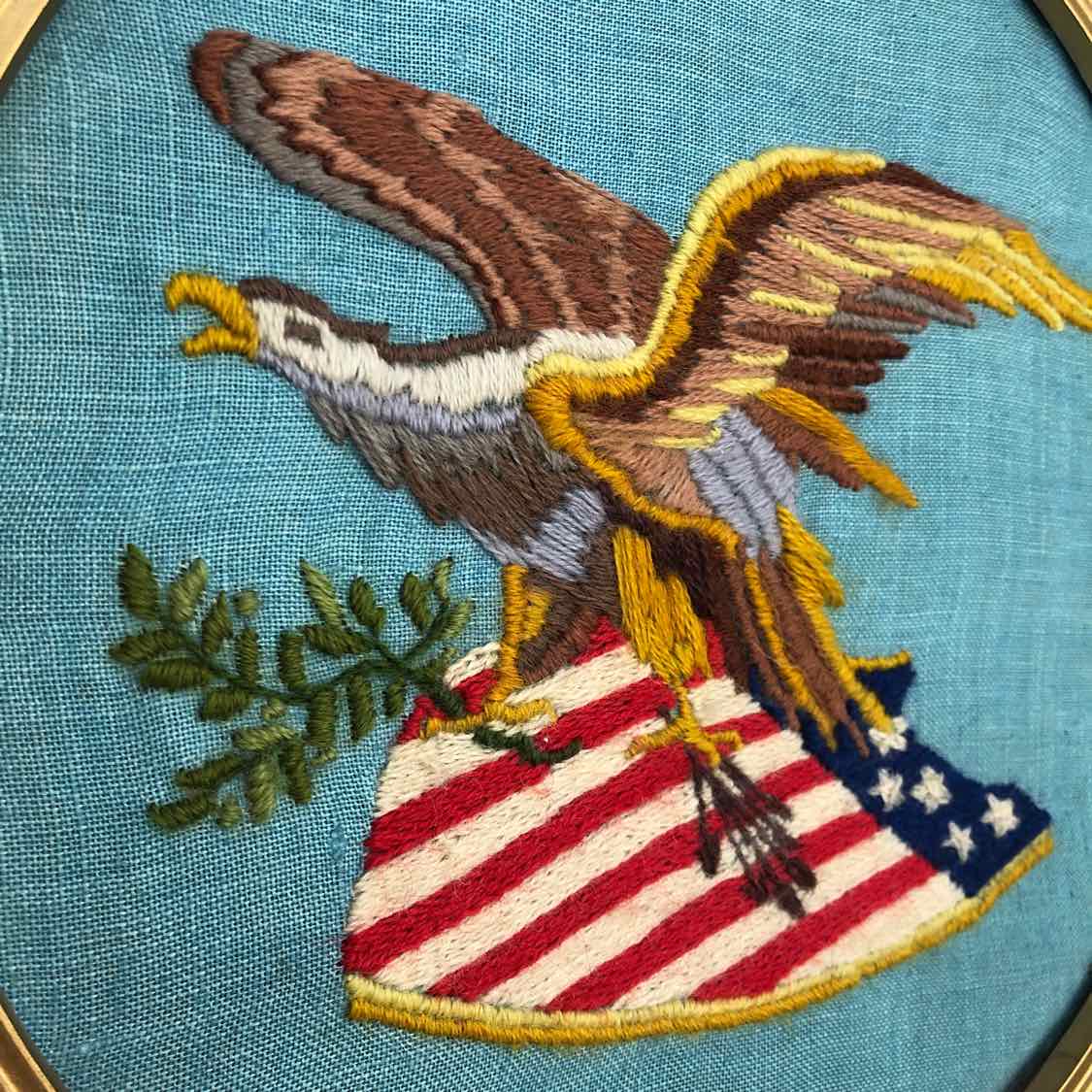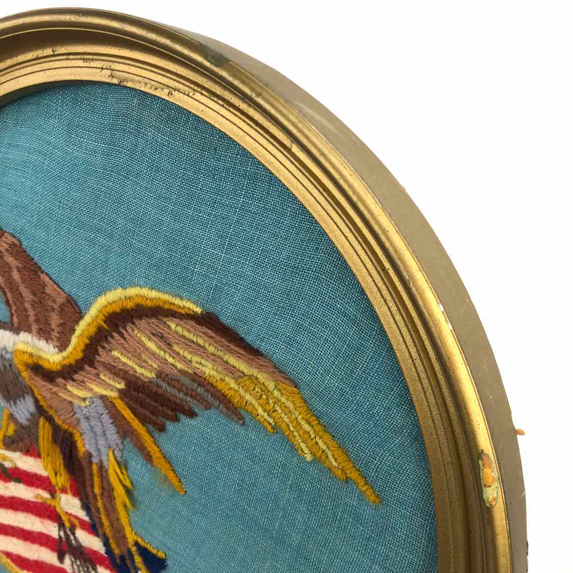 Hand stitched vintage crewel Eagle on American flag stars & stropes shielf, on blue linen in a round gold circle frame. In overall good vintage condition with some light wear and tear from age as shown.