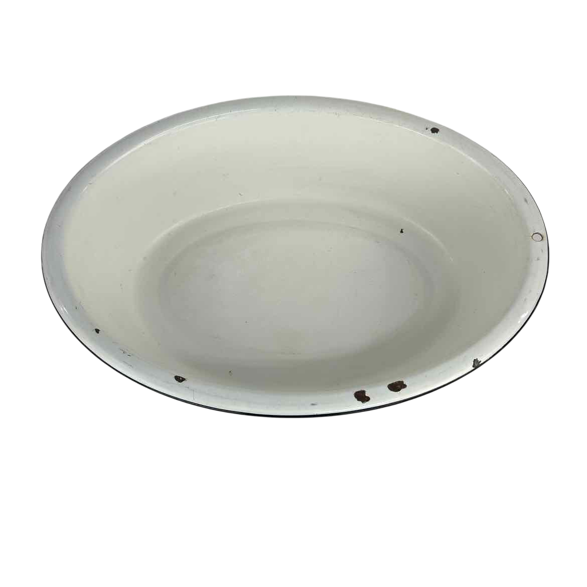 Large oval shaped enamel tub, perfect for farmhouse decor, a baby bathtub, or holding iced drinks at a pool party. Has some enamel chips, but is in overall great condition, with a hole for hanging up when not in use.