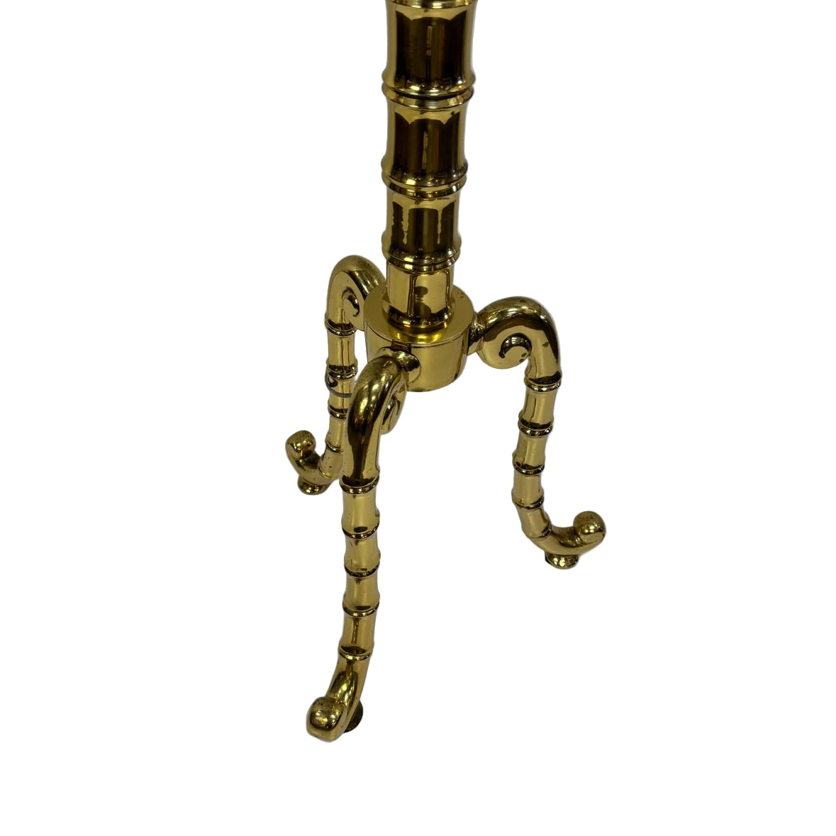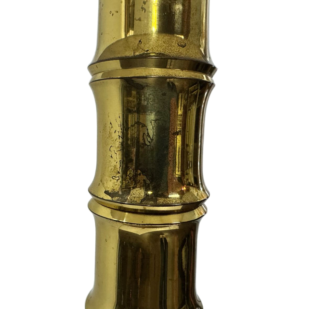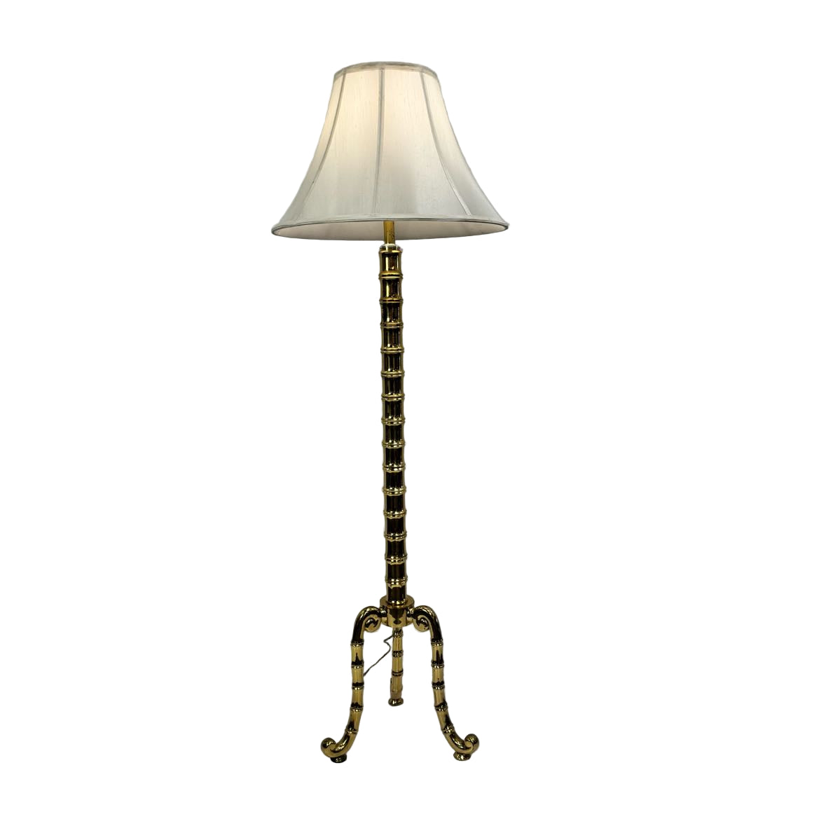 High quality solid brass faux bamboo floor lamp with three curved legs and a fluted vintage shade. The base is in excellent vintage condition & the shade has a few small areas of discoloration. This is a really special piece that we've never seen before.