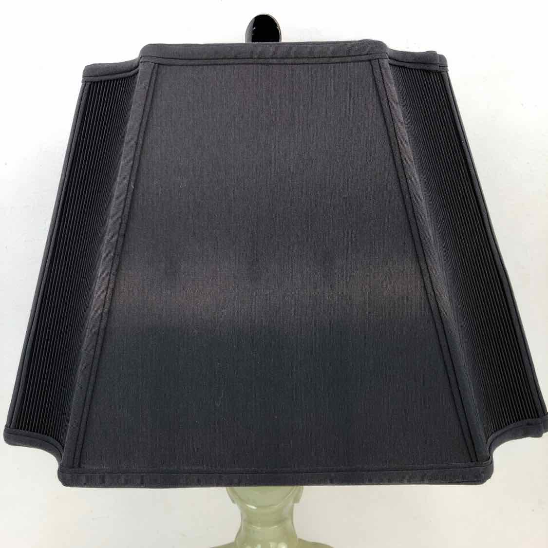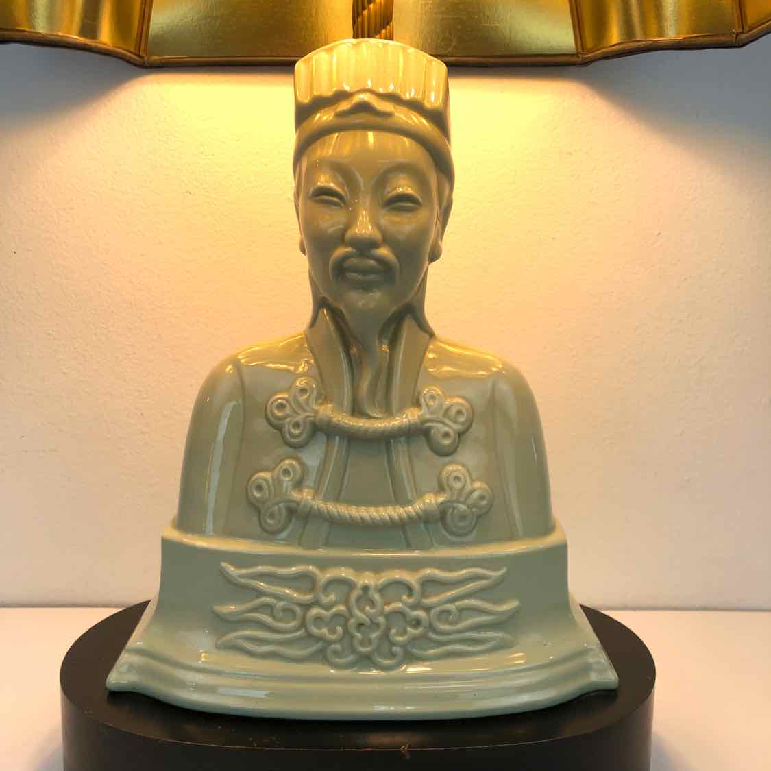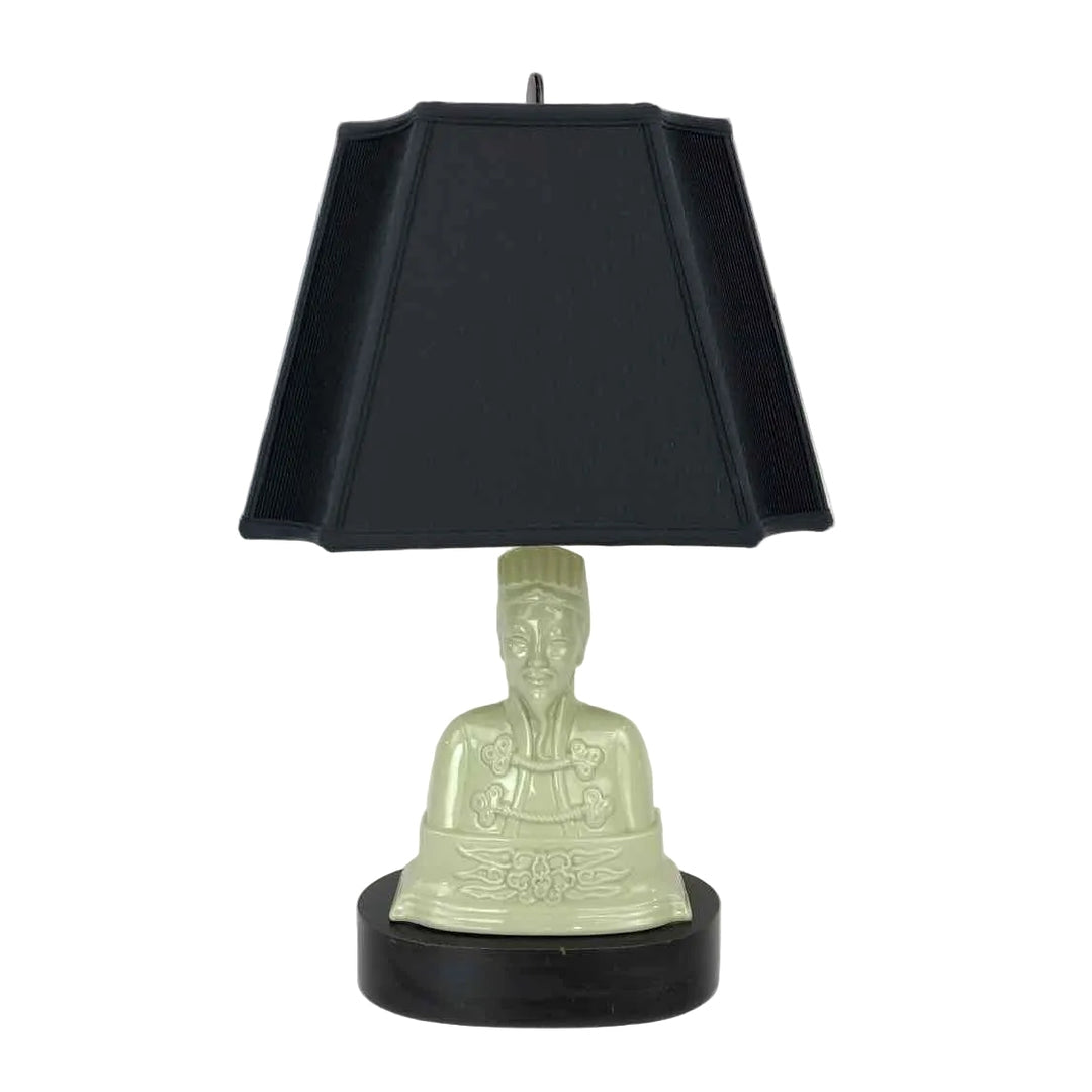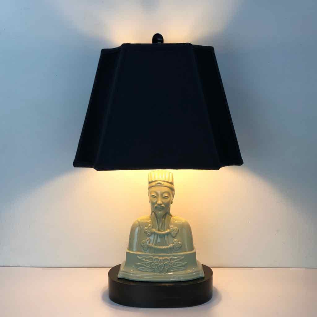 High quality figural porcelain lamp with the bust of a Chinese man in bisque porcelain with a black shade that has some sun fading on the back, but it is in otherwise excellent vintage condition and working well.