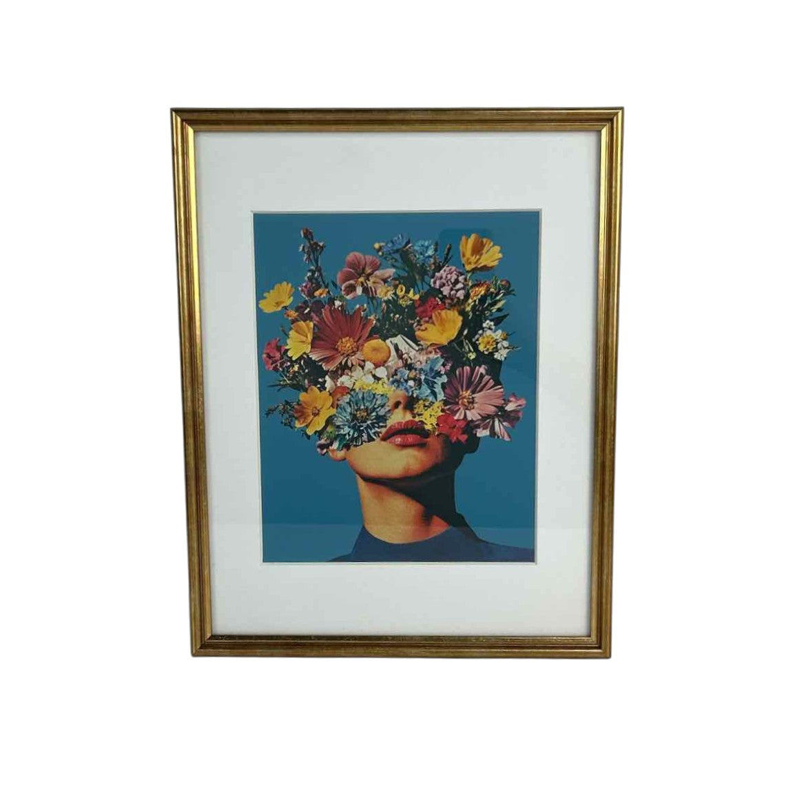 Floral Face Woman framed surrealist print | Printed on archival quality, acid-free, matte fine art paper with no border. This artwork is made to last! Framed & matted in a gold faux bamboo frame that hands with a sawtooth hanger.